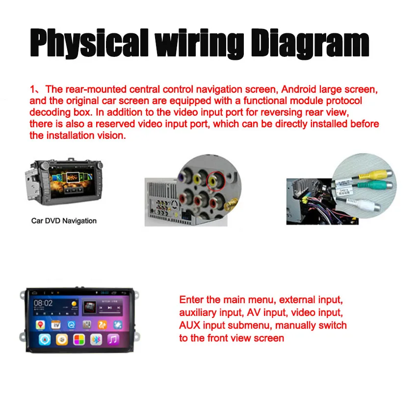 1. Задний навигационный экран Центрального управления, большой экран Android и оригинальный автомобильный экран оснащены функциональным модулем, декодирующим коробку. В дополнение к порту видеовхода для заднего вида, есть также резервный порт видеовхода, который может быть непосредственно установлен перед установкой видения.