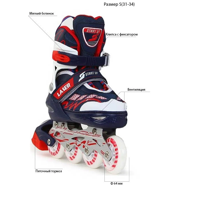 Раздвижные. Материал колес поливинилхлорид. Размер колес 70мм. Жесткость 80A. Подшипник ABEC 7, углеродистая сталь. Тормоз пяточный. Ботинок мягкий. Застежка клипса с фиксатором. Максимальная нагрузка 85кг. Вентиляция ботинка.