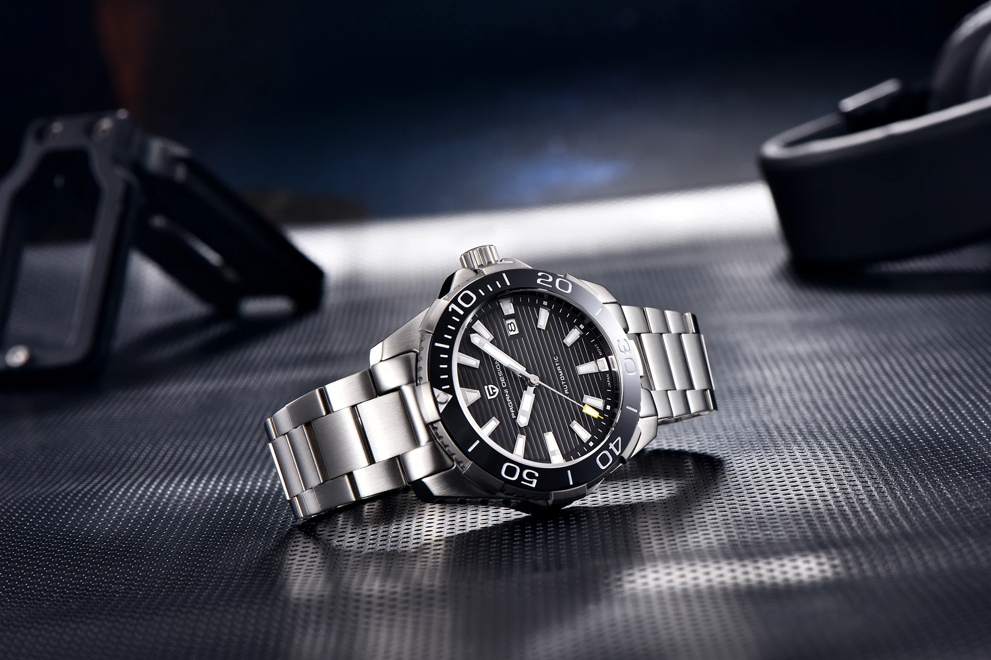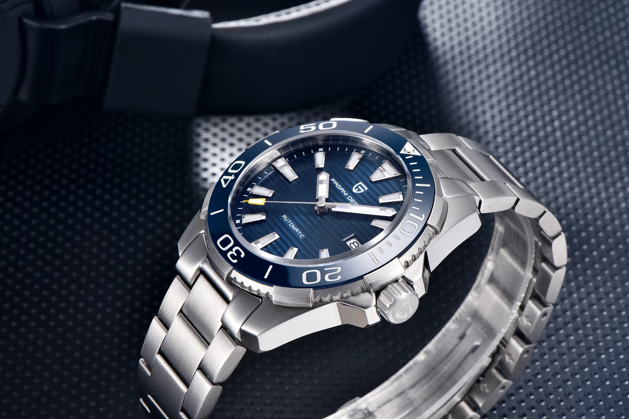 Мужская автоподзаводом часы: Pagani Design часы оснащена супер светящимся циферблатом, море-Водонепроницаемость нержавеющая сталь чехол и ремешок, так же, как вращающийся керамический безель с маркировкой при кадровой частоте 60 минут; Обратите внимание на то, что синтетический сапфировый Кристалл изогнутое зеркало, имеет очень высокий светильник передачи, Твердость сапфира является второй после бриллианта, что делает ваши часы более прочными и устойчивыми к царапинам и преломлению