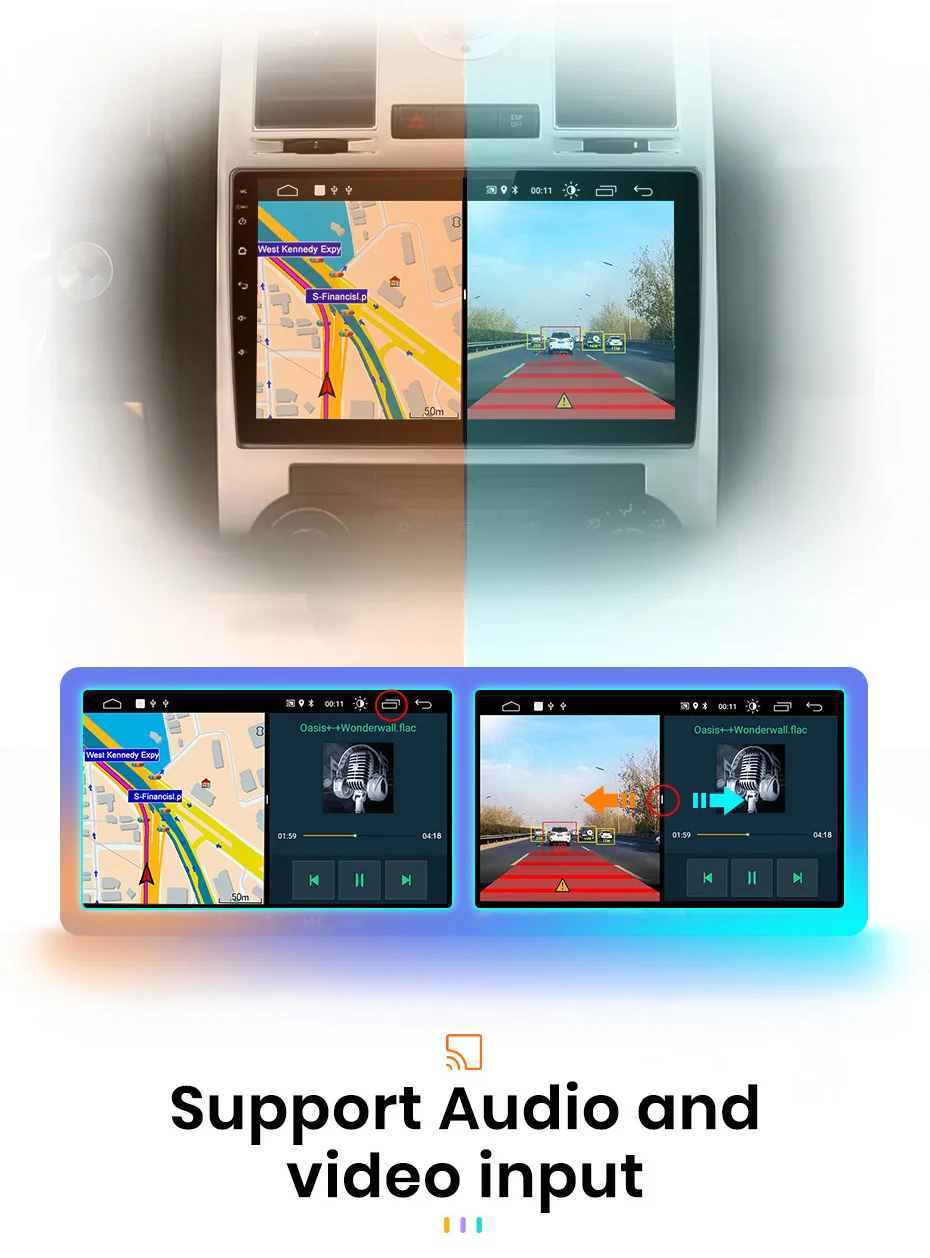 Когда автомобильное радио подключено к ADAS video recorder, это сделает передовую систему помощи при вождении, И предупредит вас, если ваш автомобиль слишком близко к переднему автомобилю или если ваш автомобиль отклоняется от полосы движения, чтобы помочь вашему вождению безопаснее и проще.