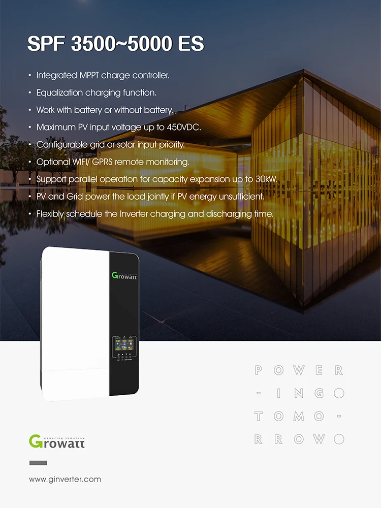 Growatt Hybrid Inverter Controller Off /On Grid 5000W 5KW KVA 48V 220/230V AC Wifi PV 450V MPPT Pure Sine Wave SPF5000 ES