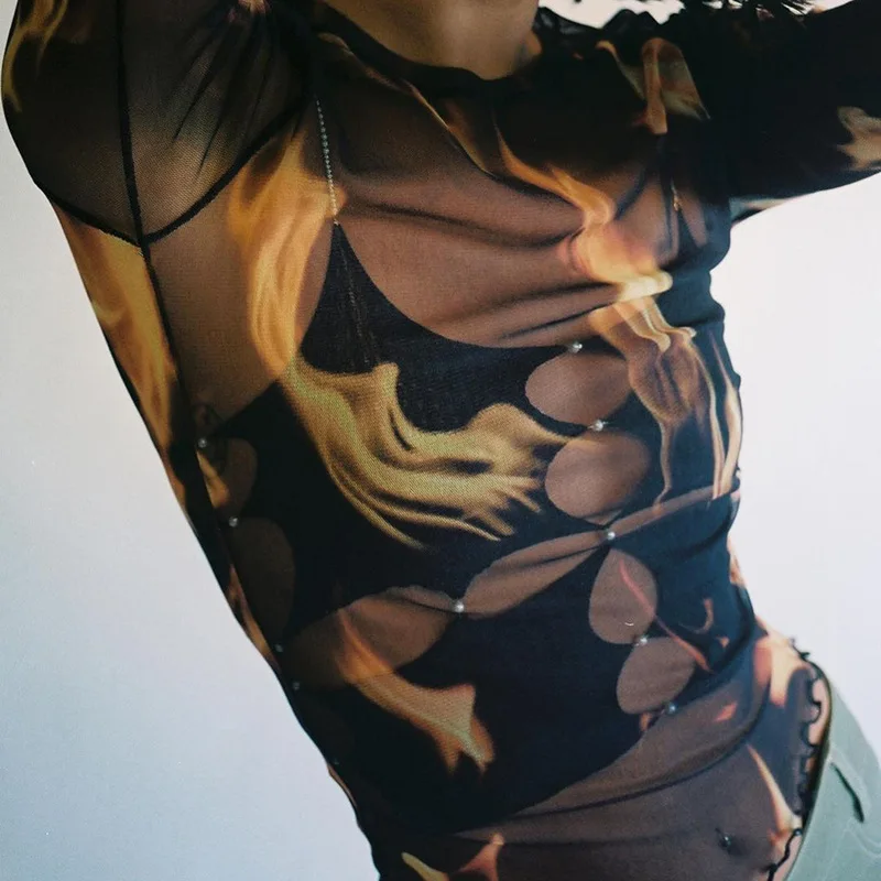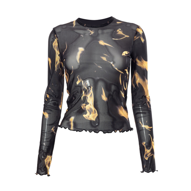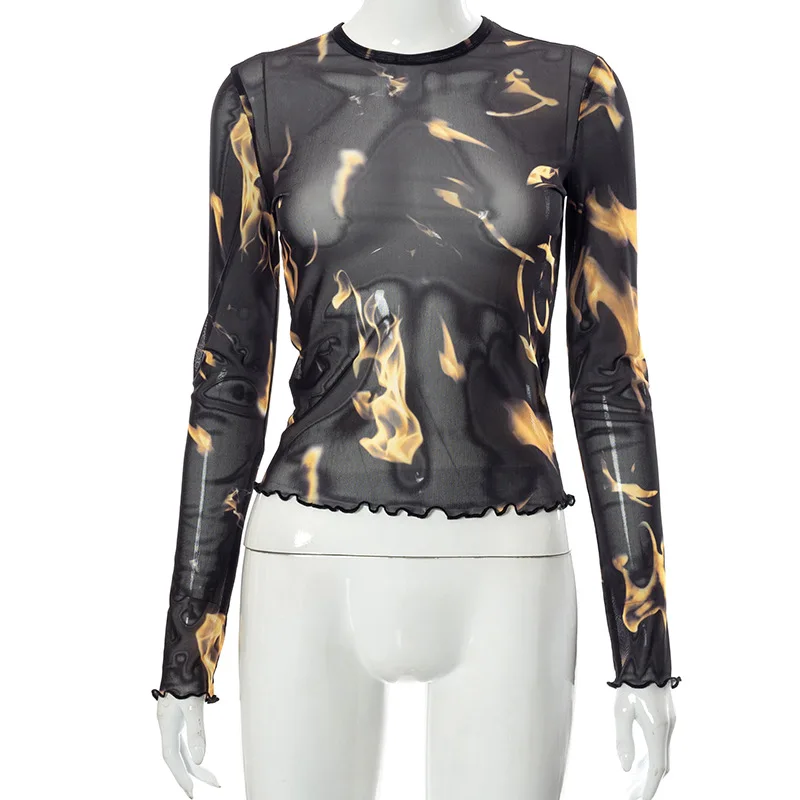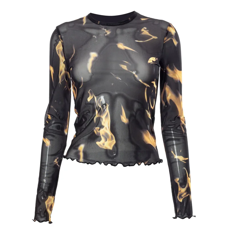 Fire Graphic Tees, женские сексуальные топы, прозрачная Y2k Эстетическая одежда, круглый вырез, длинный рукав, съедобное дерево, гриб, Готическая мода, футболка