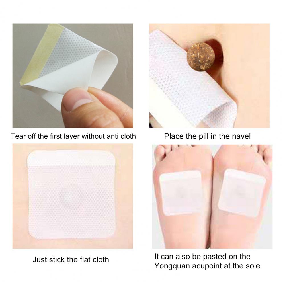 Возьмите одну таблетку перед сном каждую ночь, положите ее в кнопку живота, закрепите ее специальной наклейкой на кнопку живота и выньте ее после того, как встанете на следующий день, или вы можете взять еще две части и приклеить их на Yongquan acupoint на обеих ногах и удалить их на следующее утро.