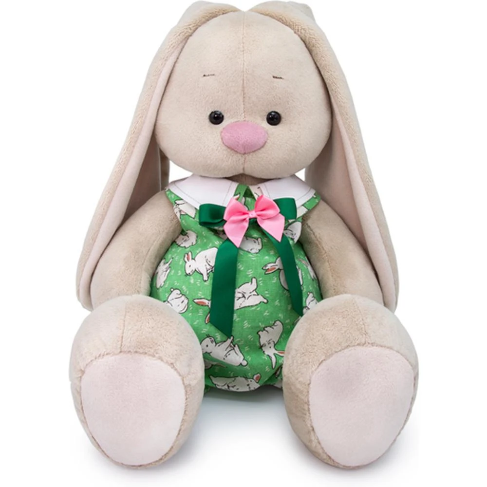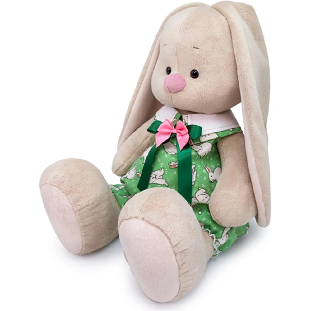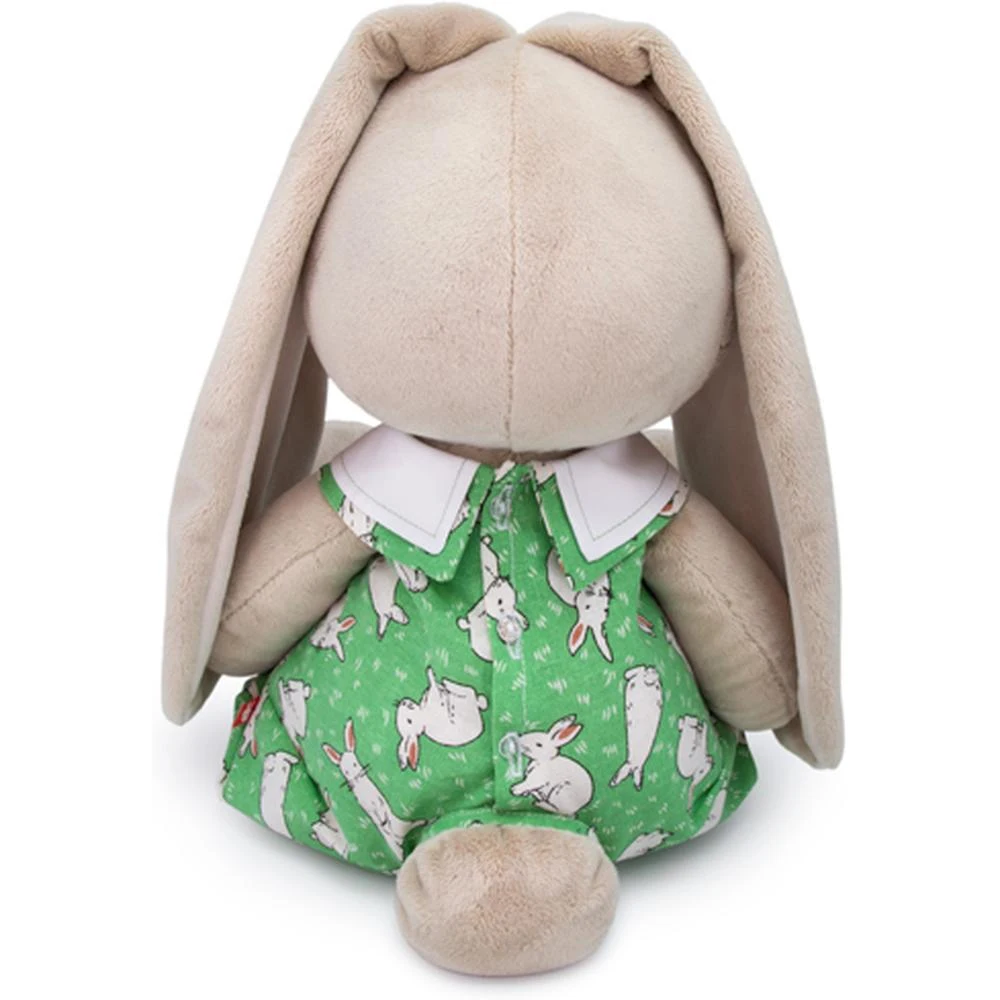 Зайка в оригинальном комбинезоне из хлопка цвета свежей зелени с интересным принтом в виде белых крольчат.