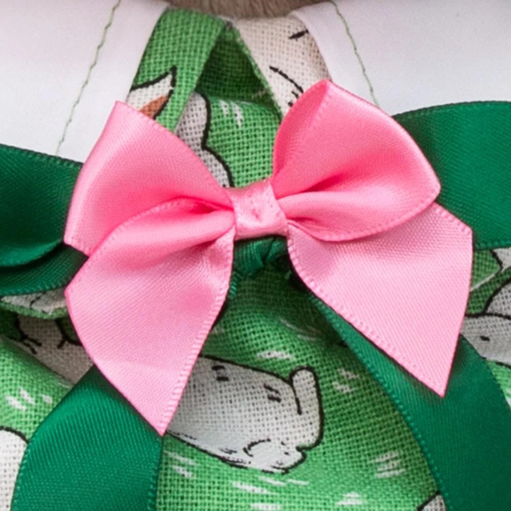 Спереди комбинезон украшает двойной атласный бант из изумрудной и розовой лент.