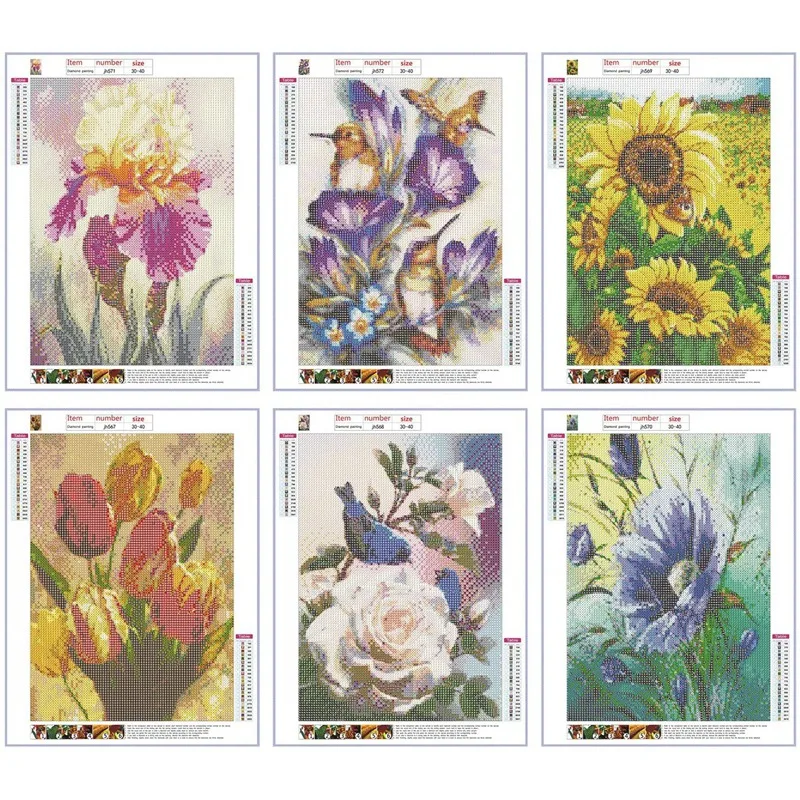 PACKAGE INCLUDES: 6 sets 5D full drill diamond painting kits flower birds diamond paint by numbers. 6x Painting canvas,6x quick point pen,6x glue,6x plastic Tray, enough round resin stereoscopic diamonds.