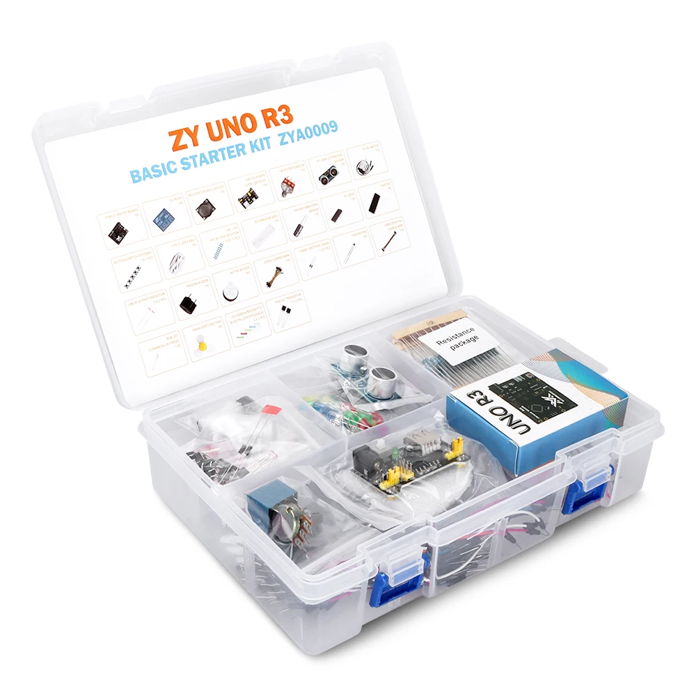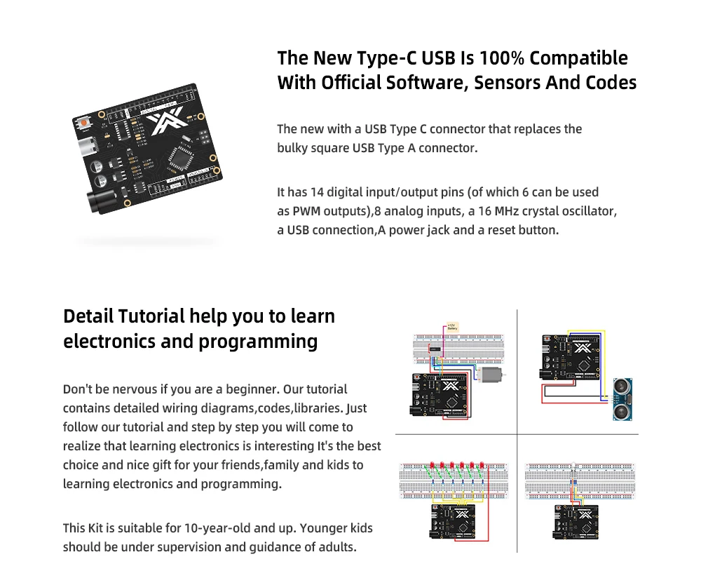 Плата контроллера Type-C-1 шт.1X830 точечный макет1 X блок питания1 X ультразвуковой датчик HC-SR041X3 вольтового источника электропитания постоянного тока1 х лопасть вентилятора1X65 шт перемычка2 транзистора NPN (PN2222)2 X диодный выпрямитель (1N4007)1 х Термистор2 X фото-резистор1 X RGB светодиодный1 usb-кабель Type-C10 X резистор (10R)Реле 5 В-1 шт.Модуль джойстика-1 шт.1 X потенциометр1 X пассивный зуммер1 х активный зуммер1 X IC 74HC5951 X IC L293D1 X переключатель наклона5 X Кнопка (маленькая)5 X красный светодиодный5 X зеленый светодиодный5 X Синий светодиодный5 X Желтый СВЕТОДИОДНЫЙ5 х Белый светодиодныйРасширение возможностей учёных и художников будущего