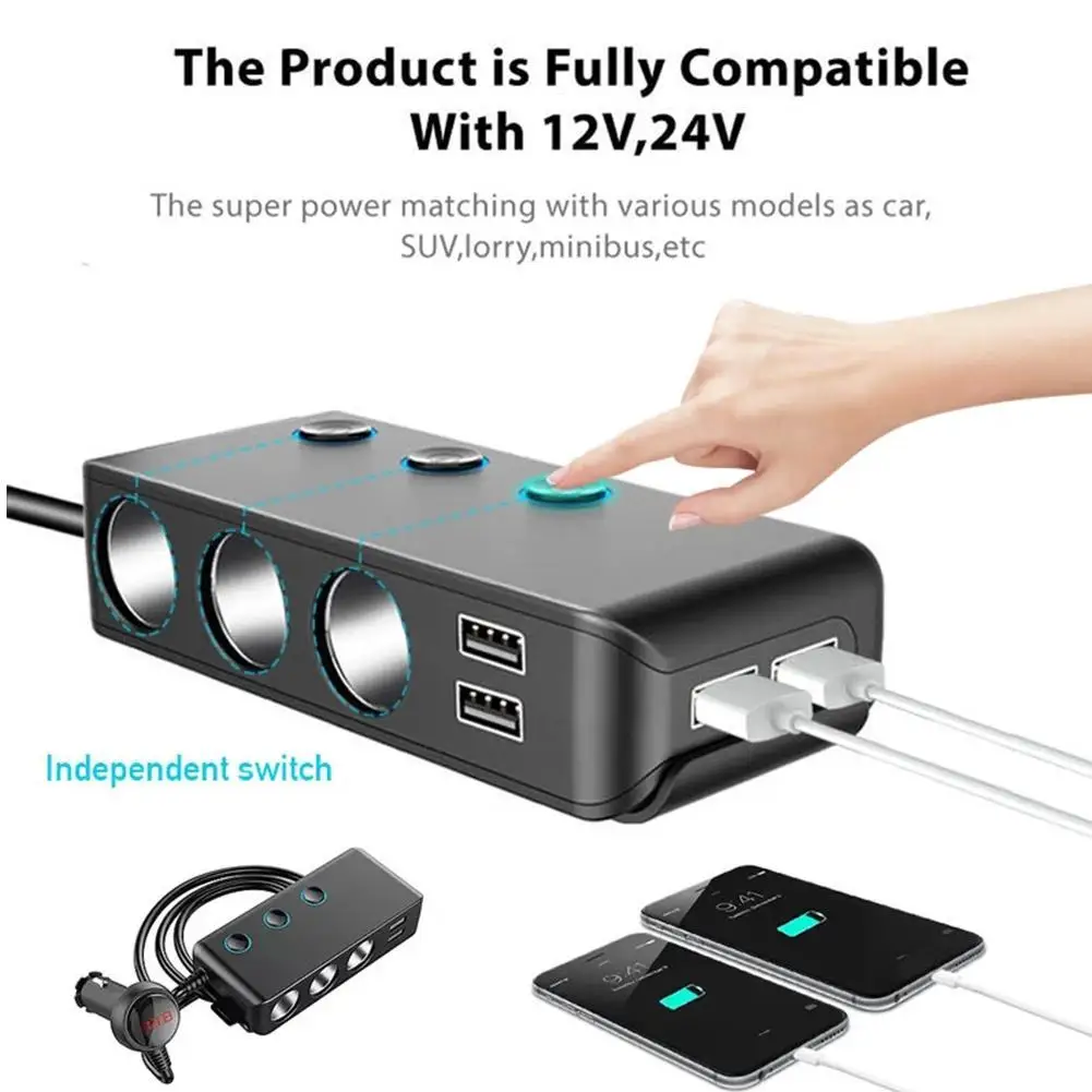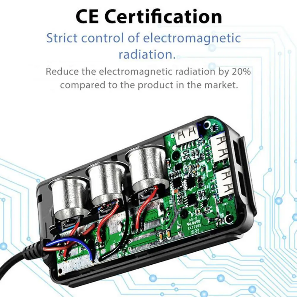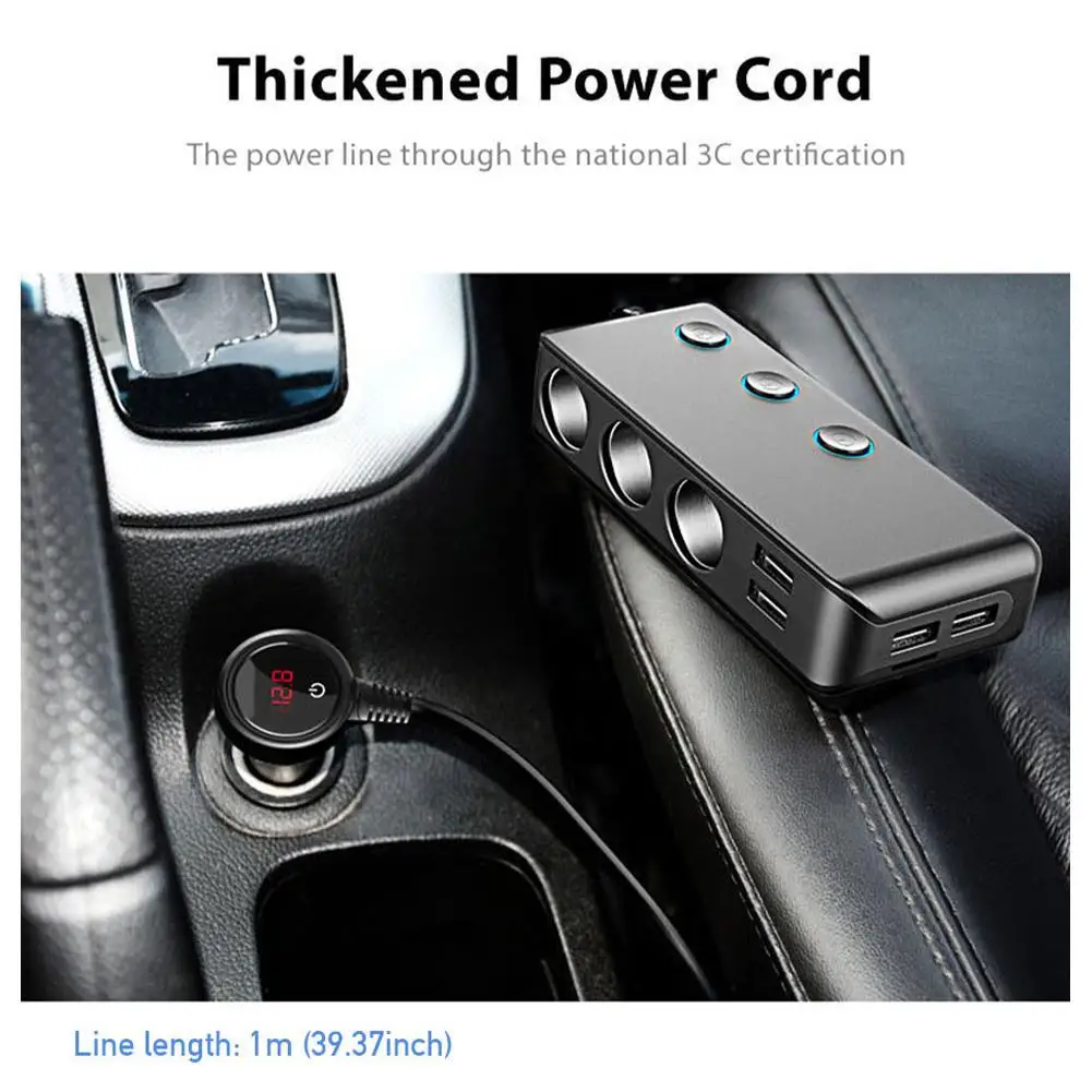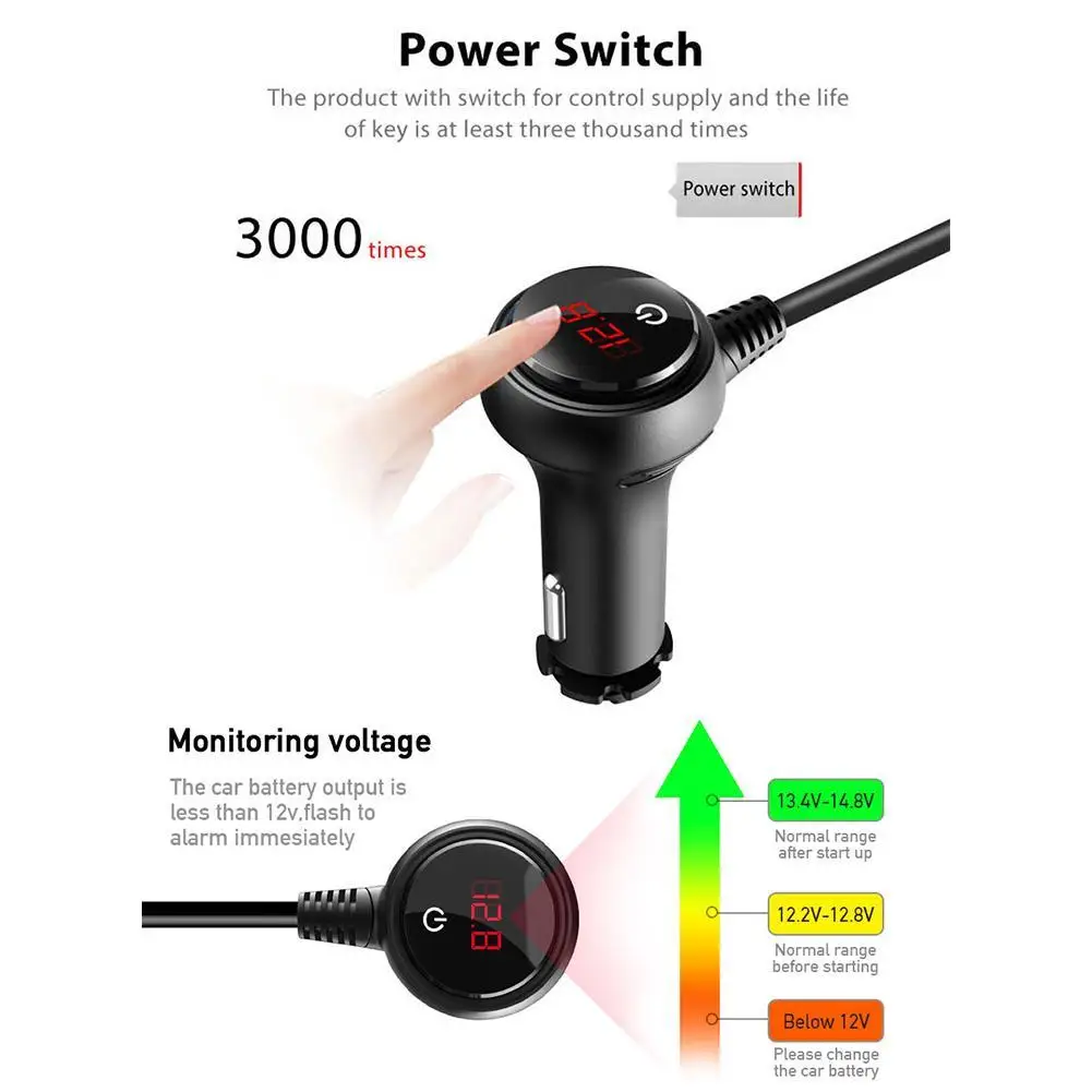 3. Модернизированный выключатель питания-был модернизирован независимый выключатель каждой зажигалки, что не только эффективно продлевает срок службы автомобильного прикуривателя, но и позволяет избежать повторного подключения и отключения, но также защищает адаптер автомобильного зарядного устройства 12 В от коротких замыканий. Главный переключатель контролирует все розетки и порты USB