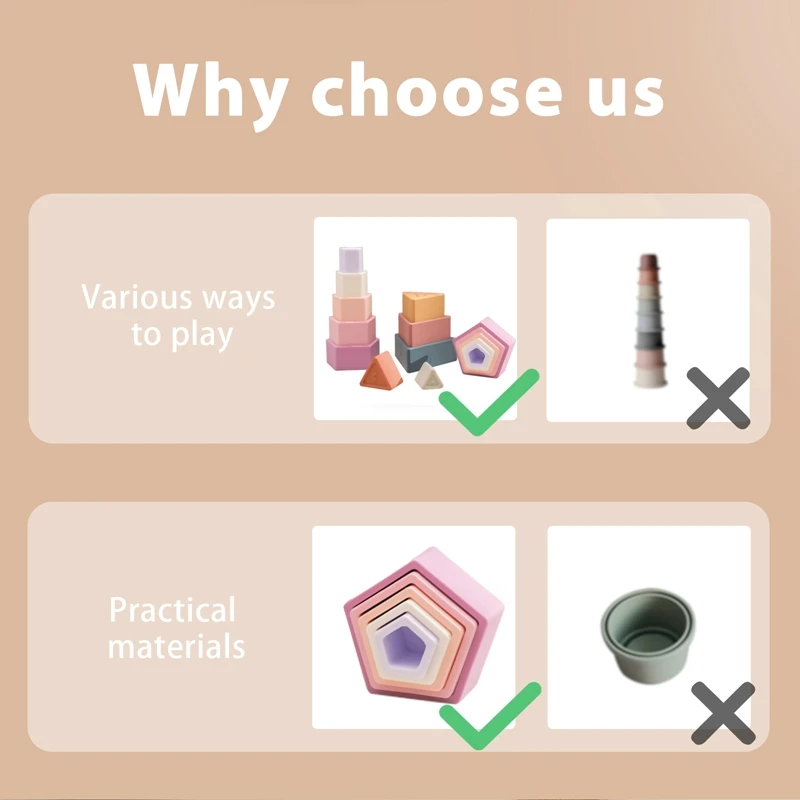 Это геометрическая игрушка для укладки пятиугольников и треугольников, которая может развивать способность конструкции детей. Все это очень мягкое, не повредит ребенка, может развивать интеллект ребенка, новая игрушка Монтессори. Есть дополнительные скидки на несколько покупок. Продукт будет иметь определенный силиконовый запах. Если вам это не нравится, вы можете положить его в вентилируемую среду в течение нескольких дней, и запах исчезнет.