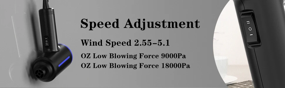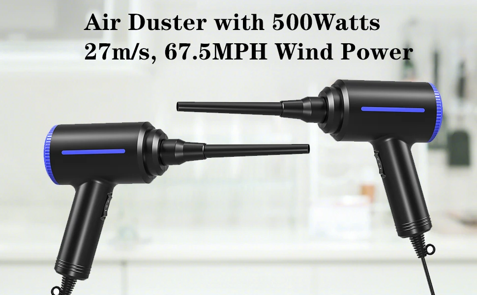 ATEnge Electric Air Duster оснащен мощным мотором мощностью 500 Вт и значением ветра 50 м/с, который может обеспечить воздух высокого давления для удаления пыли, мусора, волос, крошки и кусочки любого электронного оборудования и бытовой очистки. Есть две регулируемые настройки скорости для вас на выбор, скорость вращения до 18000 до 37000 об/мин, что обеспечивает вам гораздо более эффективную очистку.