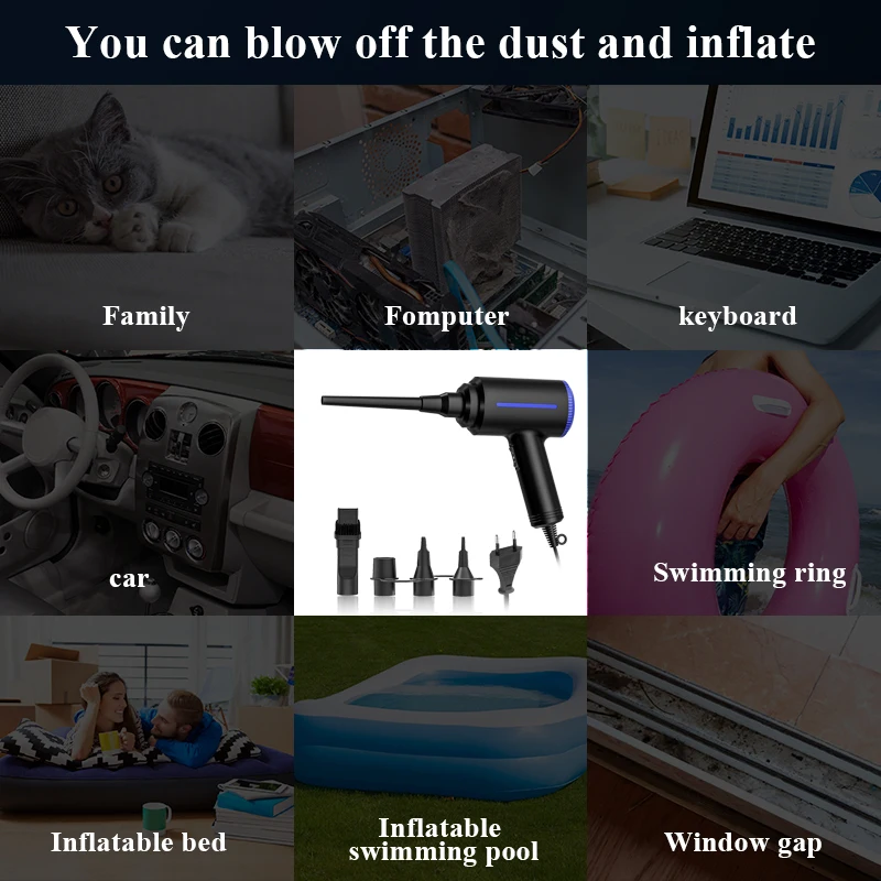 ATEnge air duster выпускает непрерывный сжатый воздух высокого давления, который может легко выдувать пыль из ваших электронных устройств, таких как компьютеры, ноутбуки, клавиатуры, копировальные машины, камеры, медицинское оборудование, интерьеры транспортных средств, жалюзи и т. Д. Поставляется с многофункциональным надувным соплом, который используется для надувного воздушного матраса, бассейна и игрушек.