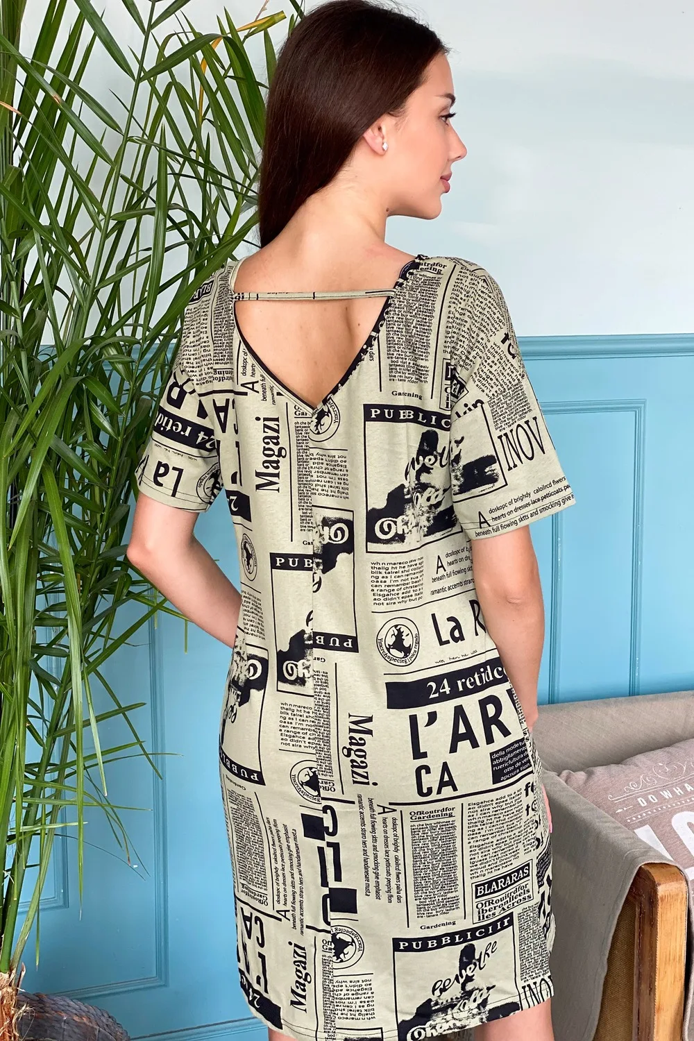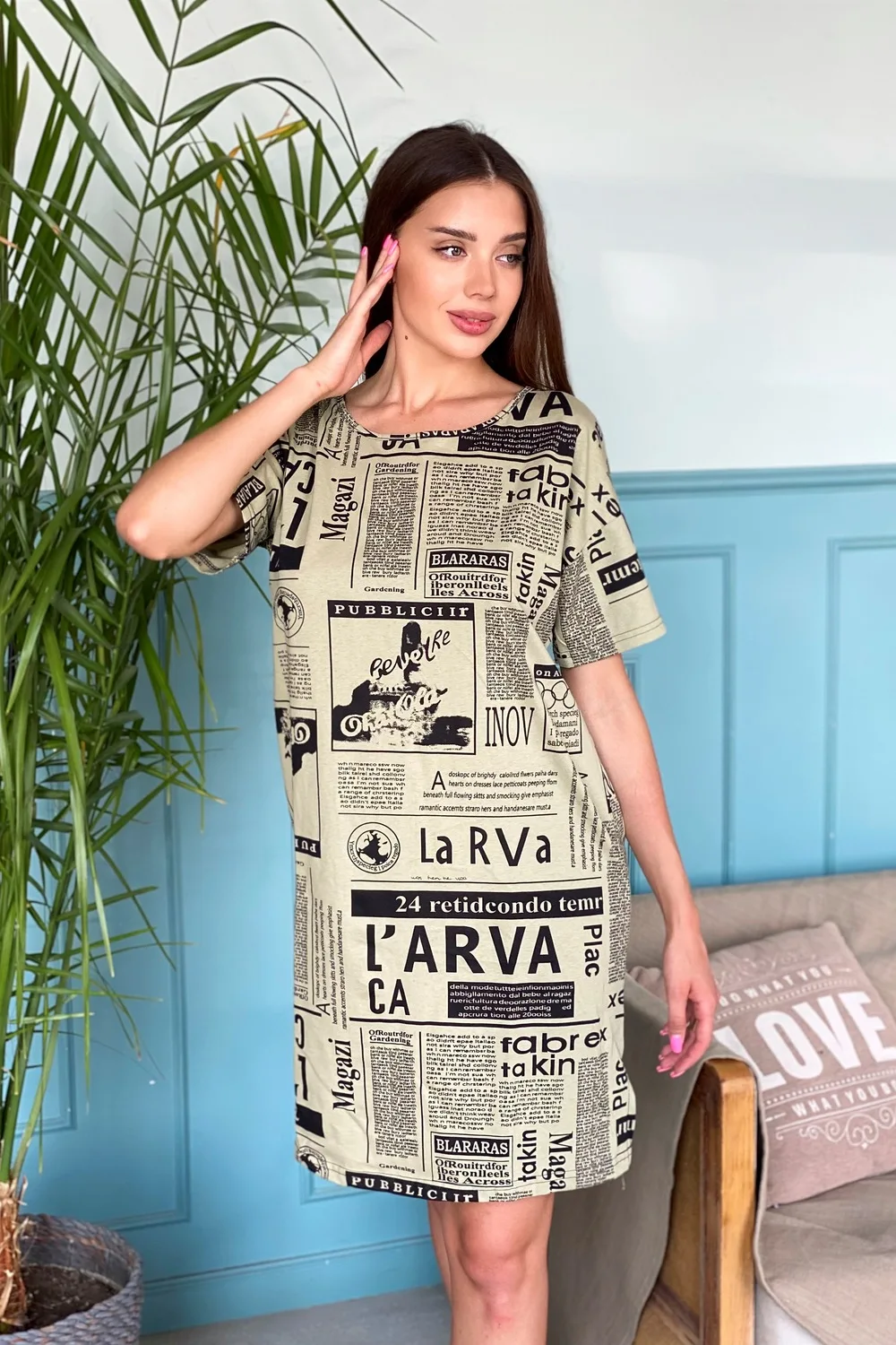 Туника прямого силуэта, с округлой горловиной, с разрезами в нижней части боковых швов. Рукав короткий. В верхней части спинки обработан фигурный вырез. Горловина обработана бейкой из основного полотна.