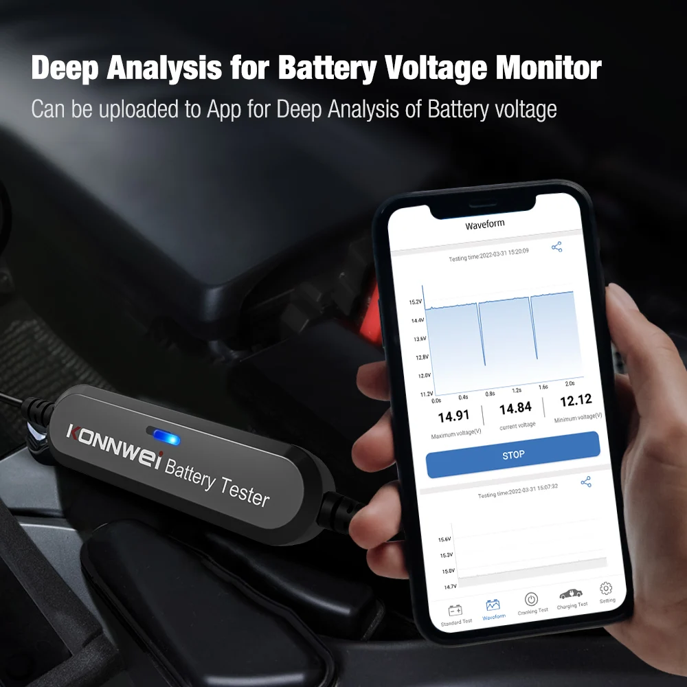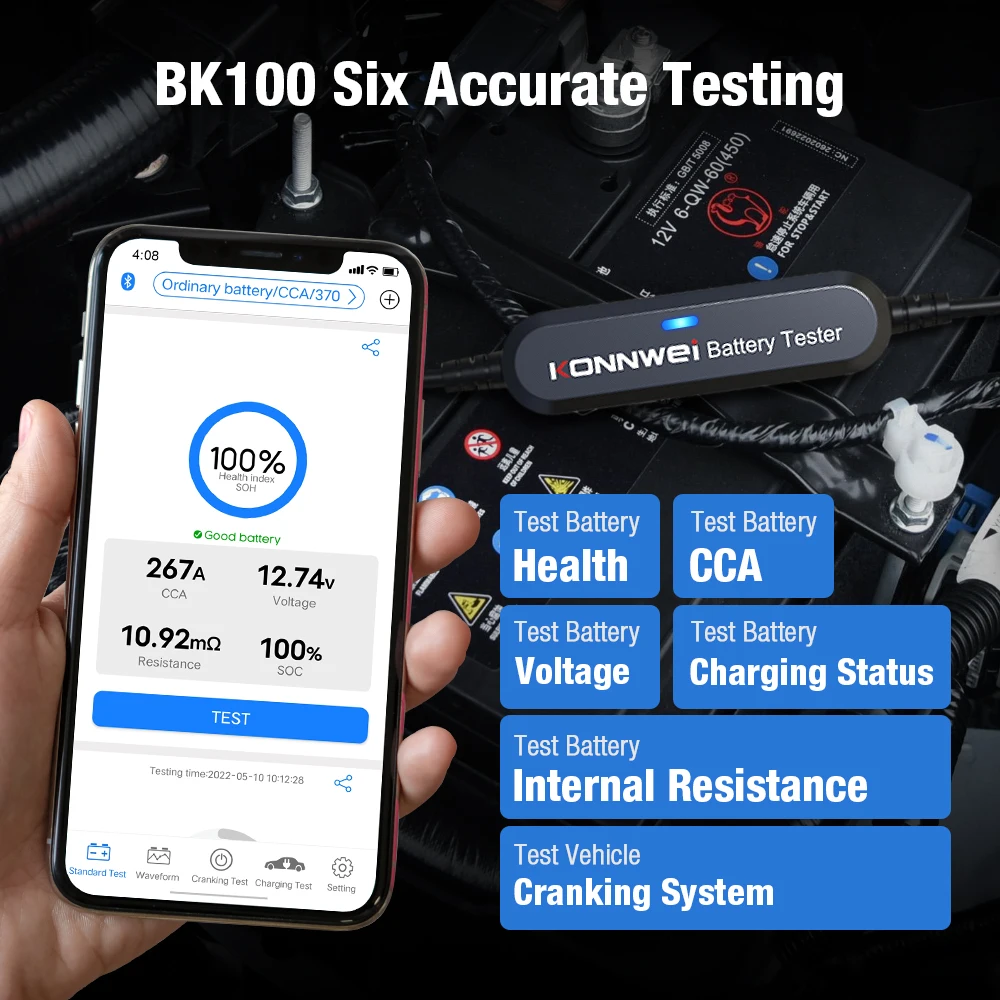 Тестер Аккумуляторов KONNWEI BK100 использует новейшие технологии Bluetooth для обнаружения вашего автомобильного аккумулятора, поэтому вам больше не придется стоять перед вашим автомобилем в ожидании вашей работы по тестированию.
