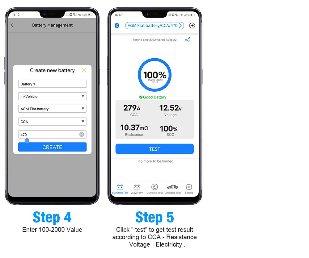 3.[нескольких типов батарей тест и сильной емкостью]:BK100 можете протестировать все 6V-12V 100-2000CCA батареи в том числе обычный свинцово-AGM плоская пластина, AGM спираль, аккумуляторная коллоидная батарея и литиевая батарея. Стандарты тестирования включают большинство стандартов батареи в мире, CCA, BCI, CA, MCA, JIS, DIN, IEC, EN, SAE