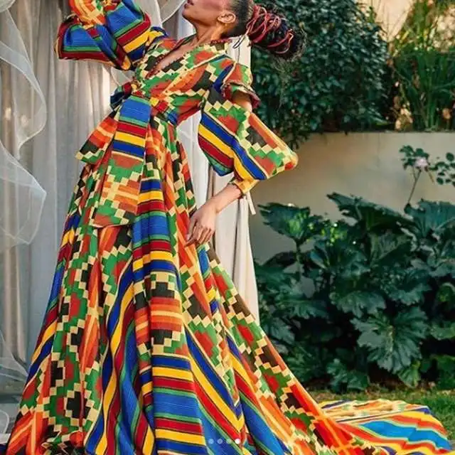Женское длинное платье в африканском стиле с принтом Дашики и v-образным вырезом, вечерние платья Анкары с длинными рукавами
