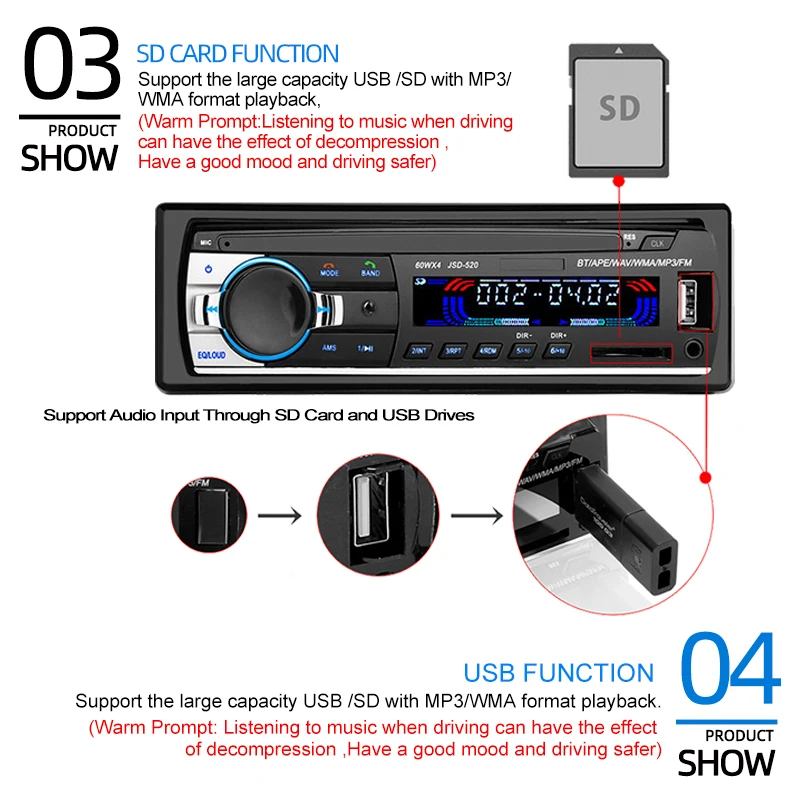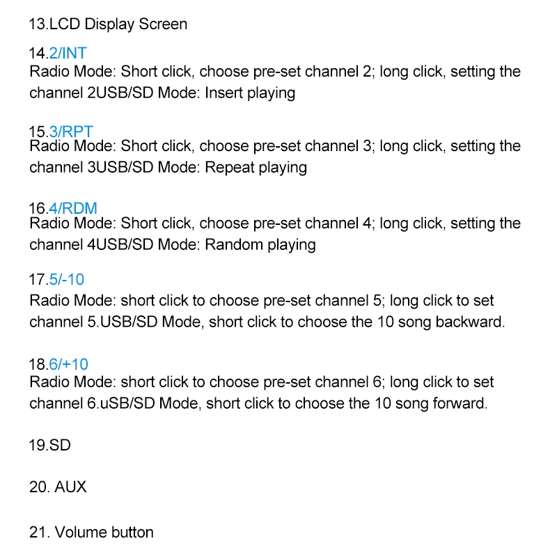 ❀ MP3 play supports pause /preview/repeat/random play and 10 tracks up/down selections.