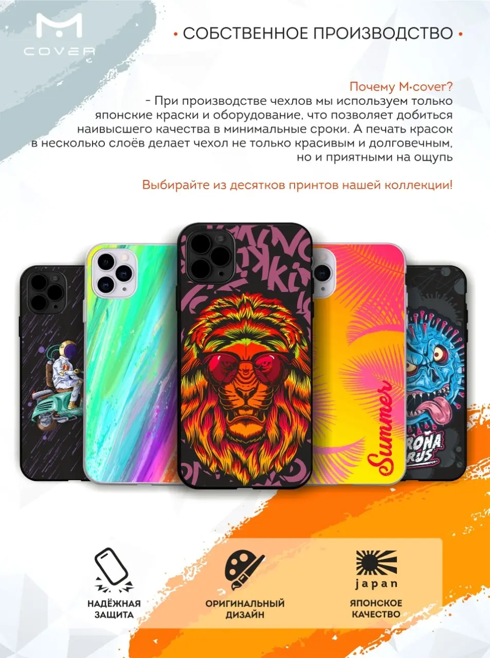 Чехол для смартфона - главный аксессуар каждого современного человека. Премиальные износостойкие краски и лаки, качественные материалы, японское оборудование и контроль качества производства - это то, что позволяет нам выгодно выделяться среди конкурентов и производить не только красивые, но и тактильно приятные чехлы, которые долгое время выглядят как новые. Плотные и прочные чехлы надёжно защитят Ваш телефон от различных механических повреждений. В наличии чехлы с изображениями на любой вкус: машины, мотоциклы, байкеры, девушки, абстракция, космонавты, фрукты, ягоды, цветы и животные (кот, лев, волк, медведь). Такой чехол станет отличным подарком себе и близким людям на День рождения и любой другой праздник.