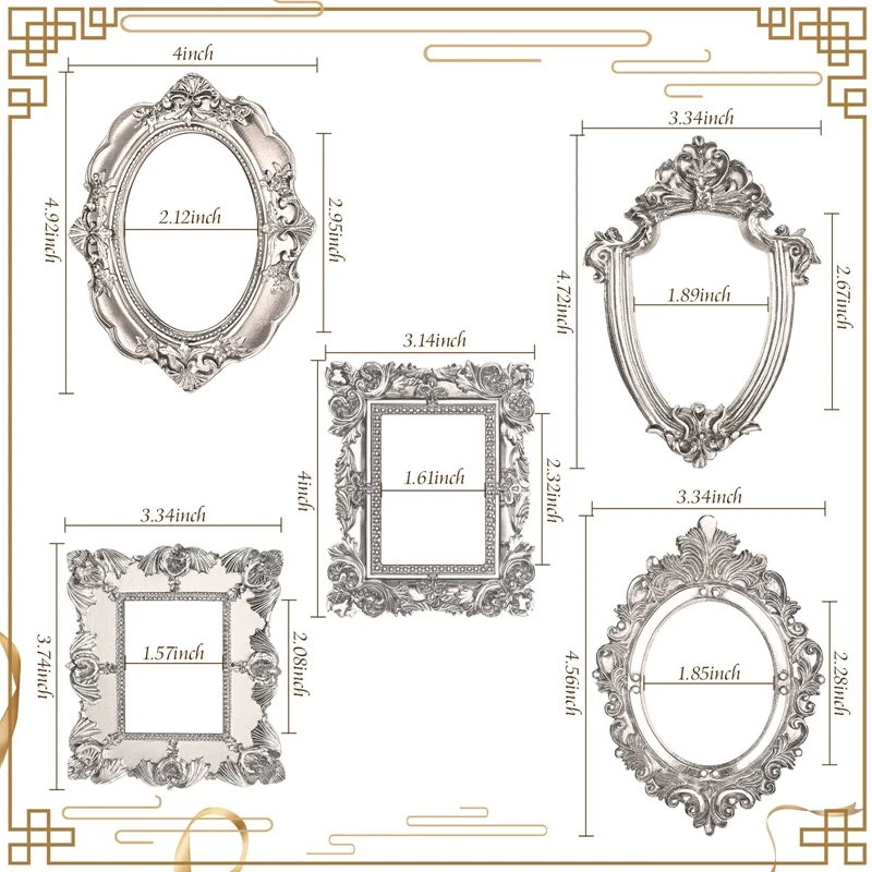 Что входит в посылка: вы получите 5 винтажных рамок для картин разных форм и размеров, креативных и красивых с металлическим блеском и хорошей текстурой, или сделай сам Ваши любимые цвета, чтобы удовлетворить ваши различные декоративные потребности