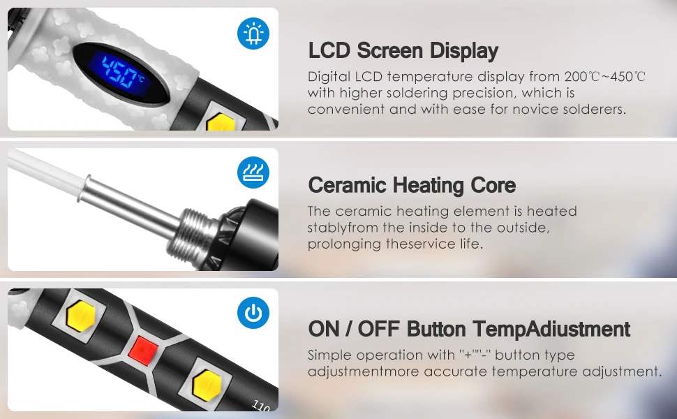 【Быстрый нагрев и регулируемая температура 】 паяльник 80 вт может быть быстро нагревается до регулируемой температуры 200-450 ℃. С выключателем питания и настройкой типа «+», «-», более точная настройка температуры. Вы можете установить температуру, просто включив.