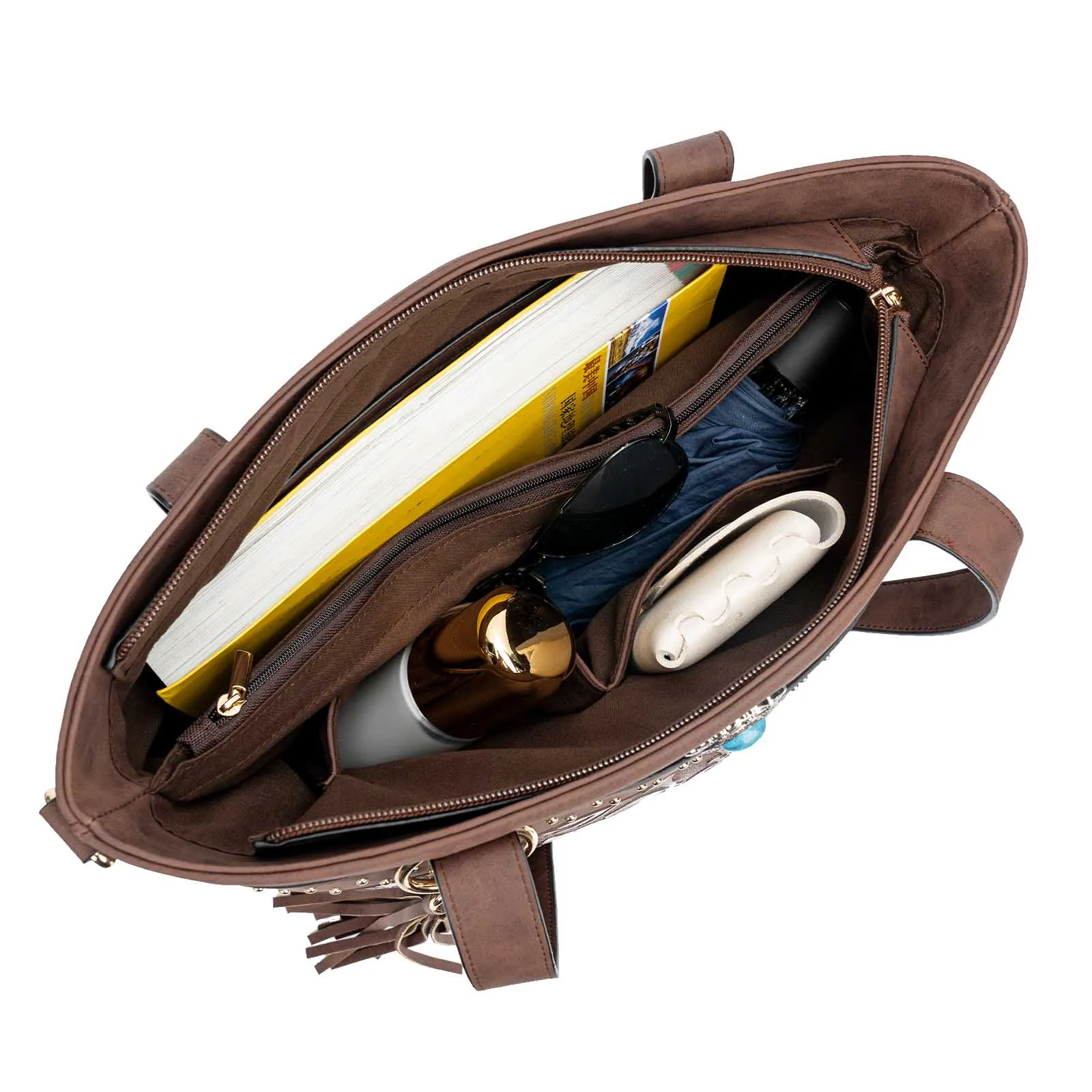 Внутри сумки есть карман на молнии, два открытых кармана и большое отделение, разделенное карманом на молнии