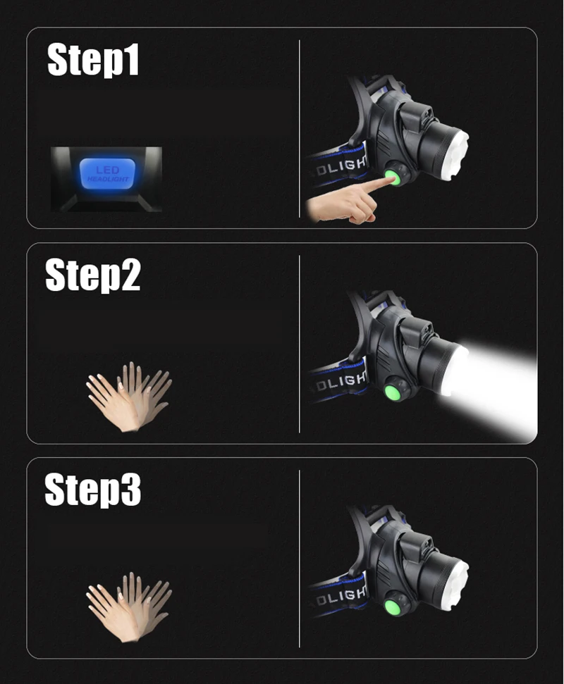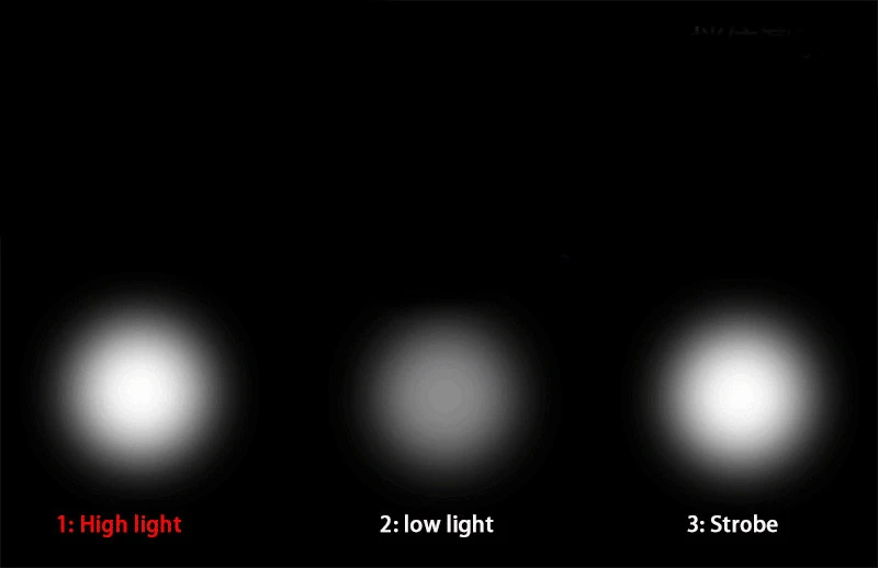 3 режима①: Высокий; ②: низкий; ③: стробоскоп;Нажмите на кнопку High(100%)- low (50%)- strobe. Время переключения памяти 1 минуту