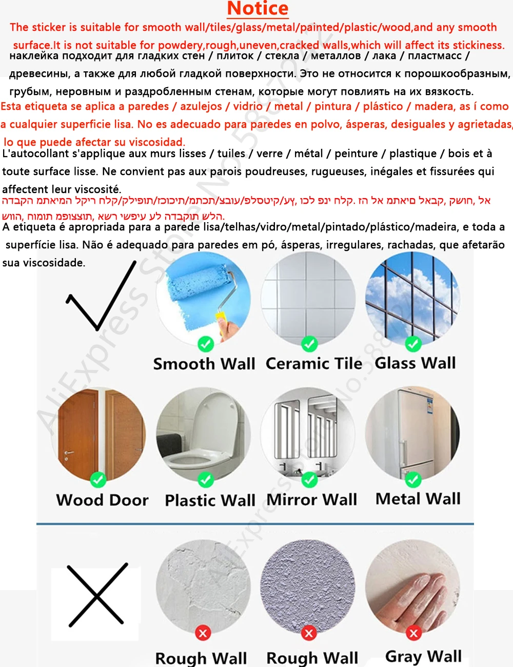 Наклейка подходит для гладкой стены/плитки/стекла/металла/окрашивания/пластика/дерева и любой гладкой поверхности. Он не подходит для порошкообразных, грубых, неровных, треснутых стен, что повлияет на его липкость.