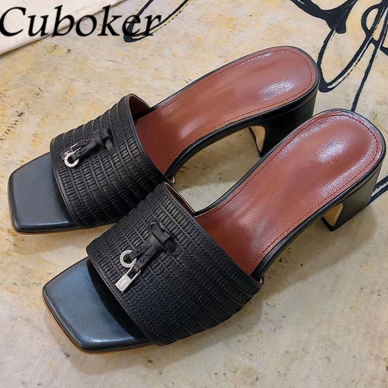 2022 летние тапочки для женщин; Кожаные кольцо с перекрестным плетением босоножки Декор туфли с открытым носком на толстом каблуке; Большие размеры; Женские туфли без задника фирменный женские туфли для подиума