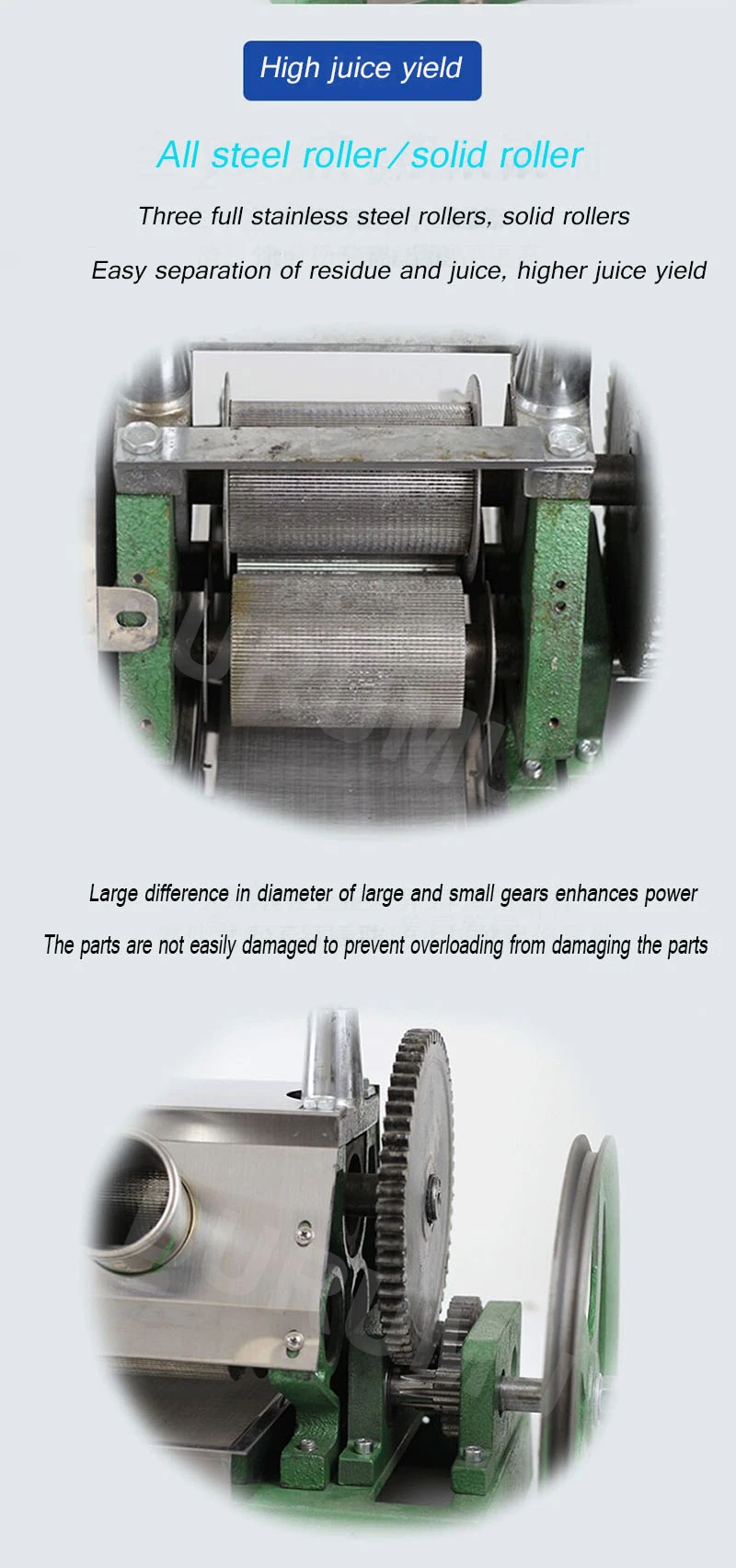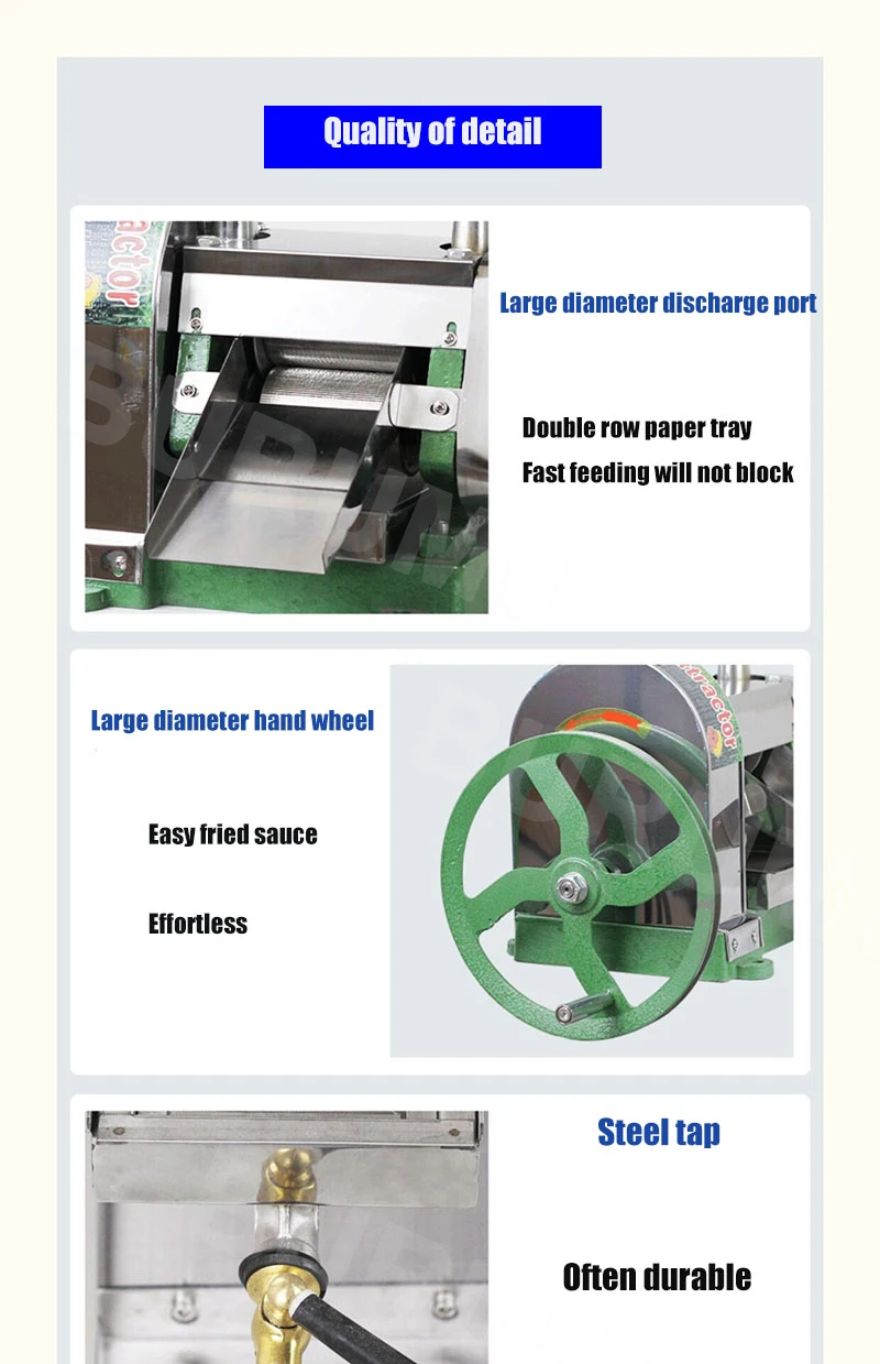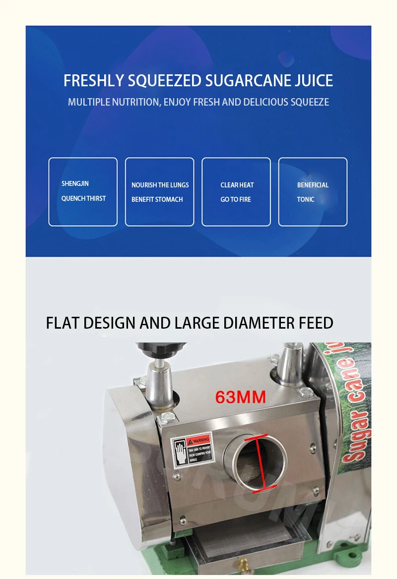 Он широко подходит для прессования сока сахарного тростника, имбиря, свежих дынь и фруктов и т. д., с несколькими функциями. Его можно использовать для извлечения различных соков сахарного тростника и других фруктовых и овощных соков по сервисным занятиям, таким как отели, караоке, фруктовые магазины, магазины холодных напитков, травяные чайные магазины, станции и супермаркеты и т. д.