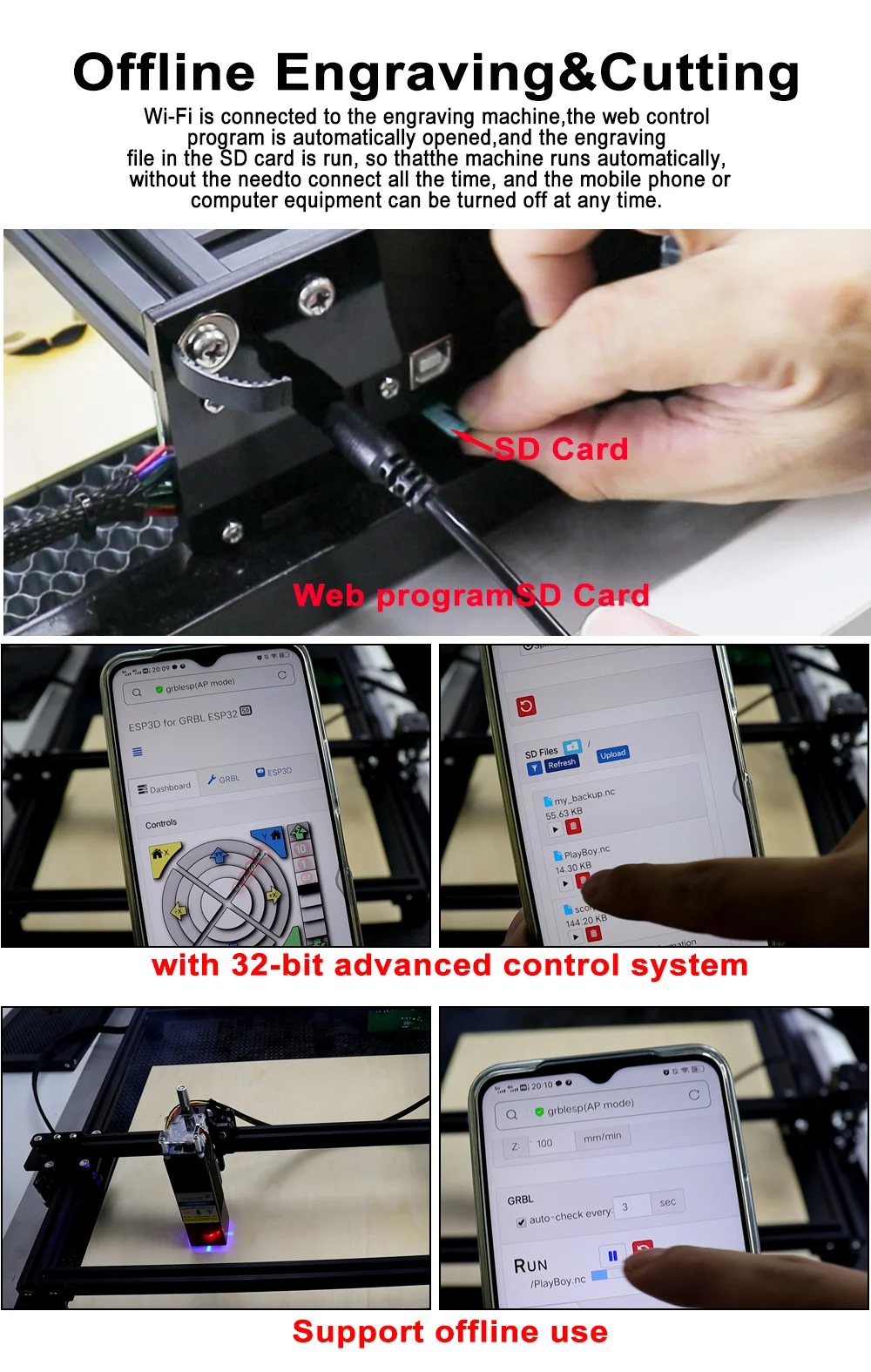 Поддержка sd-карты в автономном режиме работы патент наших инженеров, с 32-битными плата управления. Перетащите NC файл на sd-карту, машина начинает работать, а затем вы можете выключить компьютер или мобильный телефон, не беспокоясь о отключении, что более удобно печатать в течение длительного времени. Нет ограничений на компьютер, гравировка работает в любое время и в любом месте. |