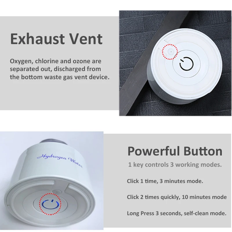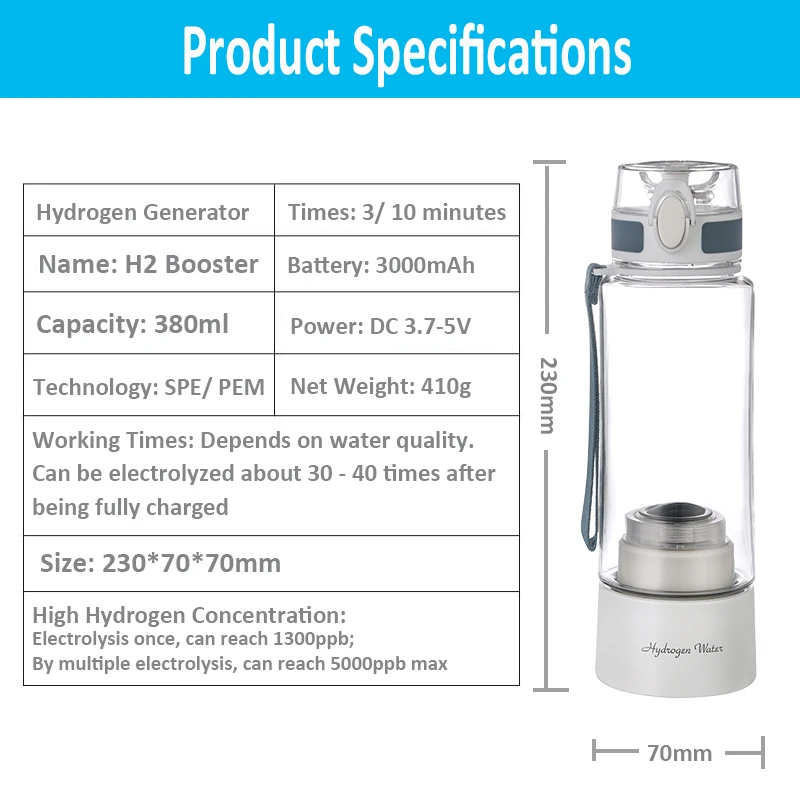Заполните бутылку * 5/6 питьевой воды, начните производство водорода в режиме 10 минут (Нажмите кнопку питания дважды быстро), затем не открывайте крышку, положите ее на 8 ~ 10 часов, затем мембрана DuPont будет успешно активирована.