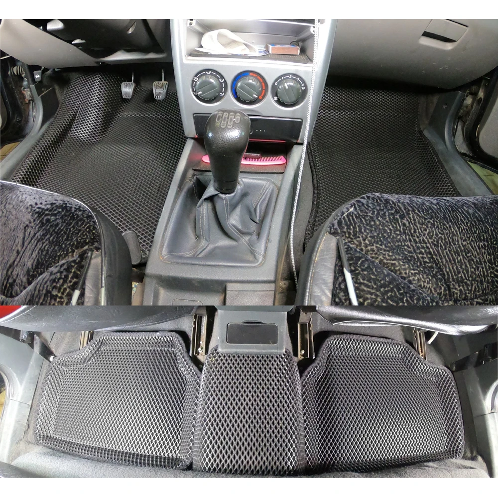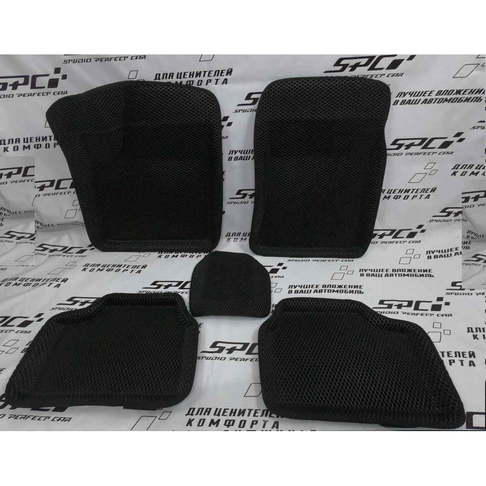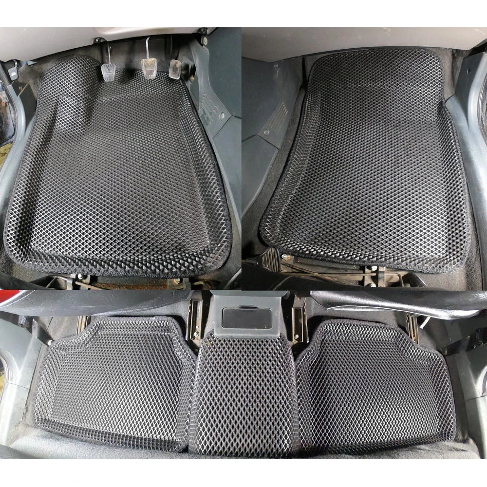 Новинка мира ковров! Коврики с Пресс Бортами. На данный момент мы являемся единственным производителем, кто формует коврики прессом, а не вручную. За счет чего борта получаются идеально ровные и не искажаются ячейки на материале. Так же за счет того, что коврики делаются специальным прессом, мы можем поставить цену на много ниже чем у остальных за счет экономии на рабочей силе. Формованные коврики EVA выполнены из приятного и лёгкого материала Ethylene Vinyl Acetate, который обеспечивает постоянный комфорт и удобство. Глубокая ячеистая структура хорошо удерживает воду и мусор даже во время активного вождения автомобиля. Чтобы очистить коврики от скопившейся грязи, достаточно перевернуть их. Материал ковров прекрасно переносит высокие и низкие температуры, спокойно переносит контакты с химическими реагентами. Не деформируется и не пахнет при жаре до +50 °С, не становится хрупким и не трескается при морозе до -40 °С. Основной идеей данных ковров является то, что данные ковры можно эксплуатировать без бортов, ведь вся влага собирается в самой текстуре ковриков. Вкупе с этим, данные коврики очень легко вытряхиваются от грязи. Все это работает если пол автомобиля полностью ровный, в том числе под педалями. Если же пол автомобиля не ровный, то влага, собирающееся на неровностях будет стекать в соседние соты, а затем за пределы коврика, что недопустимо. Именно поэтому начали появлятся eva 3d коврики. Коврики, которые повторяют контур пола автомобиля, со всеми его неровностями. Это гарантирует задержку влаги и грязи в пределах ковриков, да и к тому же такие коврики более лаконично смотрятся в салоне авто.