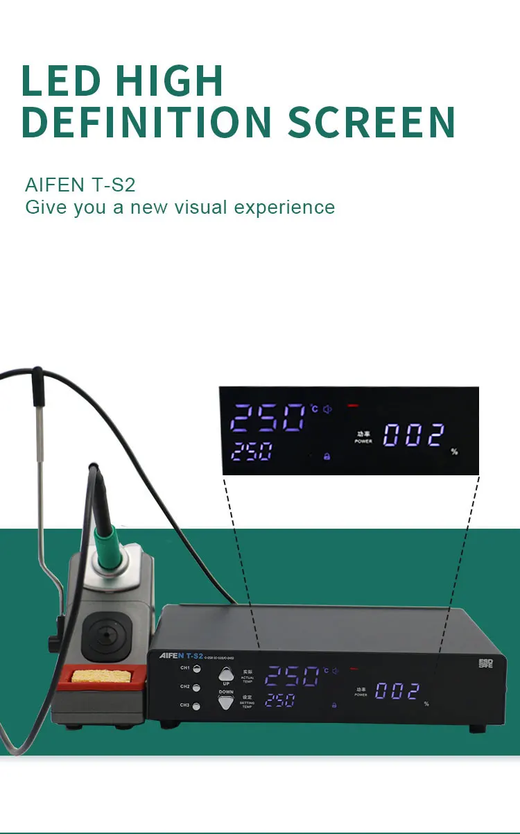 AIFEN T-S2, это паяльная станция, которая может быть использована самостоятельно, и может быть расширена до двойной паяльной станции s, est une station de soudage intelligente совместимый avec la poignée T115/T210/t245, совместимость с avec les pointes de soudage JBC, la poignée a un anneau métallique dormant. Lorsque la poignée est insérée dans le support, elle passe automatiquement en mode veille. La station de soudage est équipée de trois pointes de fer à souder (I, is, K). La temperature de la station de soudage est contrélée par le programme de la puce, qui est différente de la station de soudage traditionnelle qui utilse la tension alternative et la vitesse de chauffage est rapide et précise.