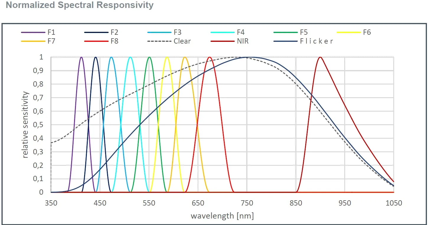 AS7263 может обнаруживать спектры: 610nm, 680nm, 730nm, 760nm, 810nm и 860nm