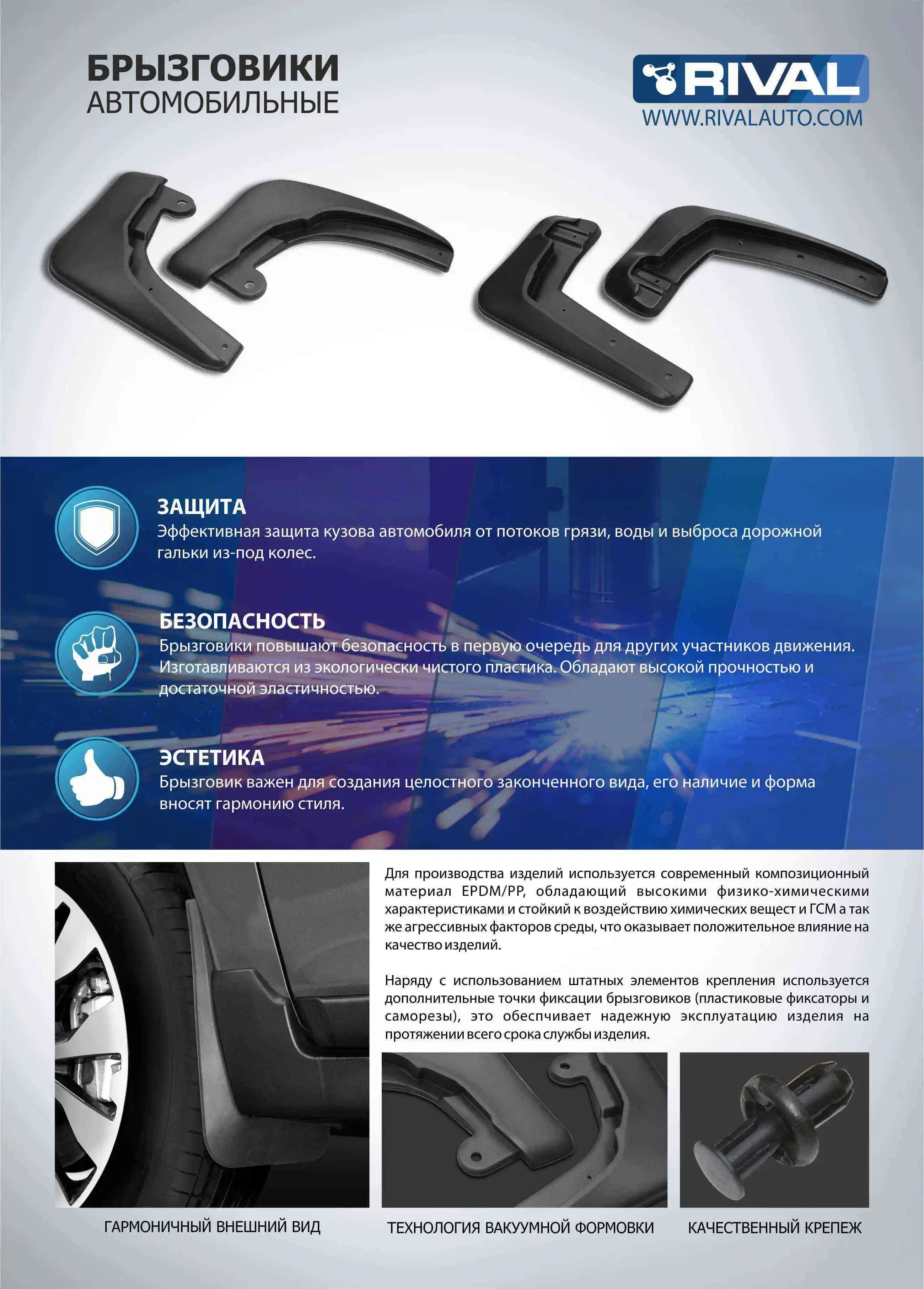 Брызговики Rival защищают покрытие автомобиля от грязи, мусора и посторонних предметов, летящих из-под колес вашего автомобиля во время движения.