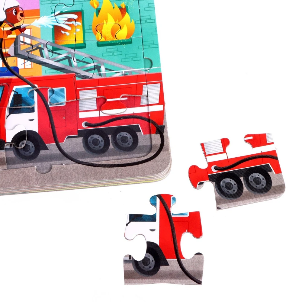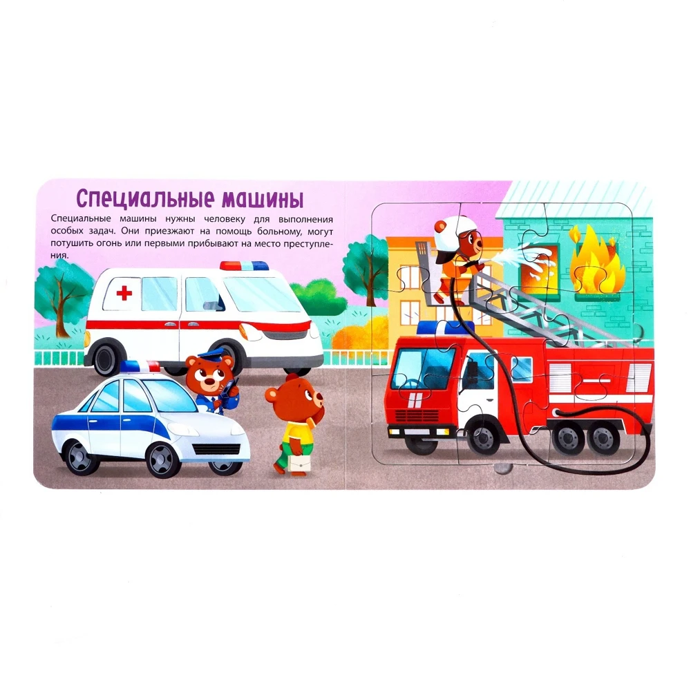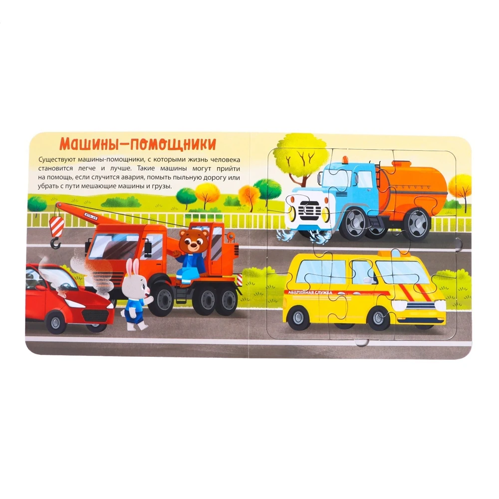 В этой чудной книге малыша ждёт не только полезный для людей транспорт, но и пазлы.