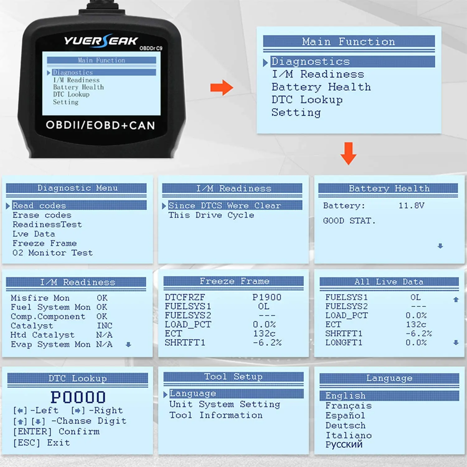 OBDDr C9 считыватель кодов двигателя работает на большинстве 1996 американских, 2000 европейских и азиатских автомобилей, И более новые OBD II и может отечественные или импортные транспортные средства быстро считывают и стирают DTC на всех OBD II протоколов транспортных средств: CAN, J1850 PWM, J1850 VPW, ISO9141 и KWP2000 и доступны для глобальных клиентов, поддерживая 7 языков: английский, французский, испанский, немецкий, русский, итальянский, финский.