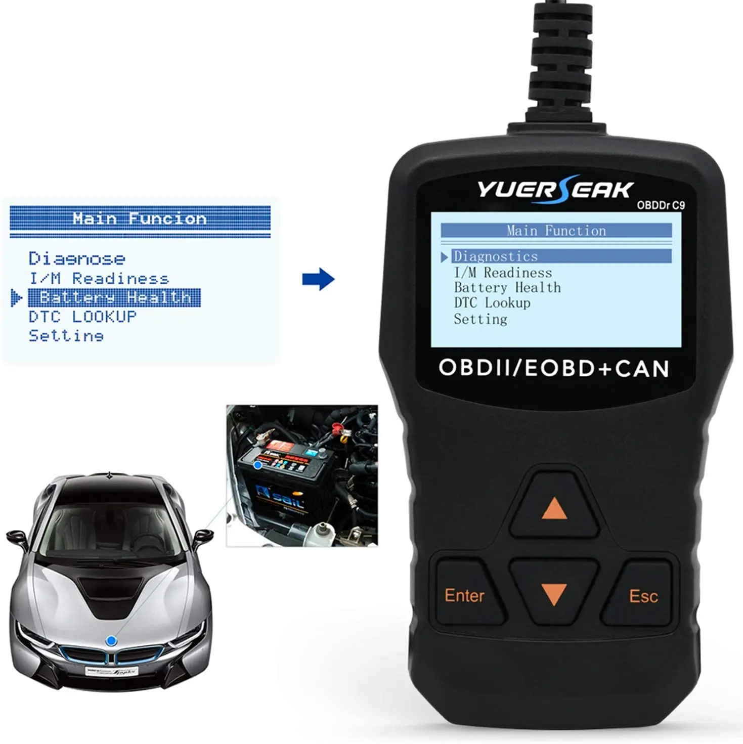 Диагностический инструмент YUERSEAK OBDDr C9 OBDIIПомогает вам определить, нужно ли вашему автомобилю отремонтировать или нет, когда проверяйте фары двигателя, включите приборную панель, что может сэкономить ваше драгоценное время и деньги