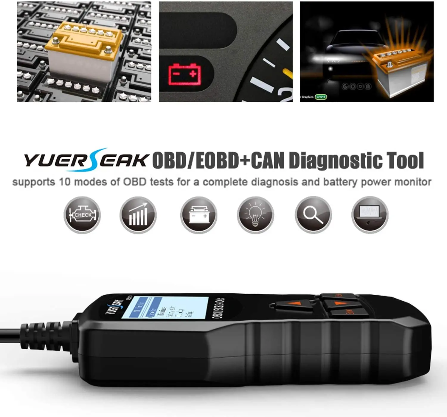 Он поддерживает 10 полных режимов OBD и имеет специальную функцию тестирования батареи, которая позволяет контролировать состояние батареи в режиме реального времени, покупая сейчас и исправляя что-то!