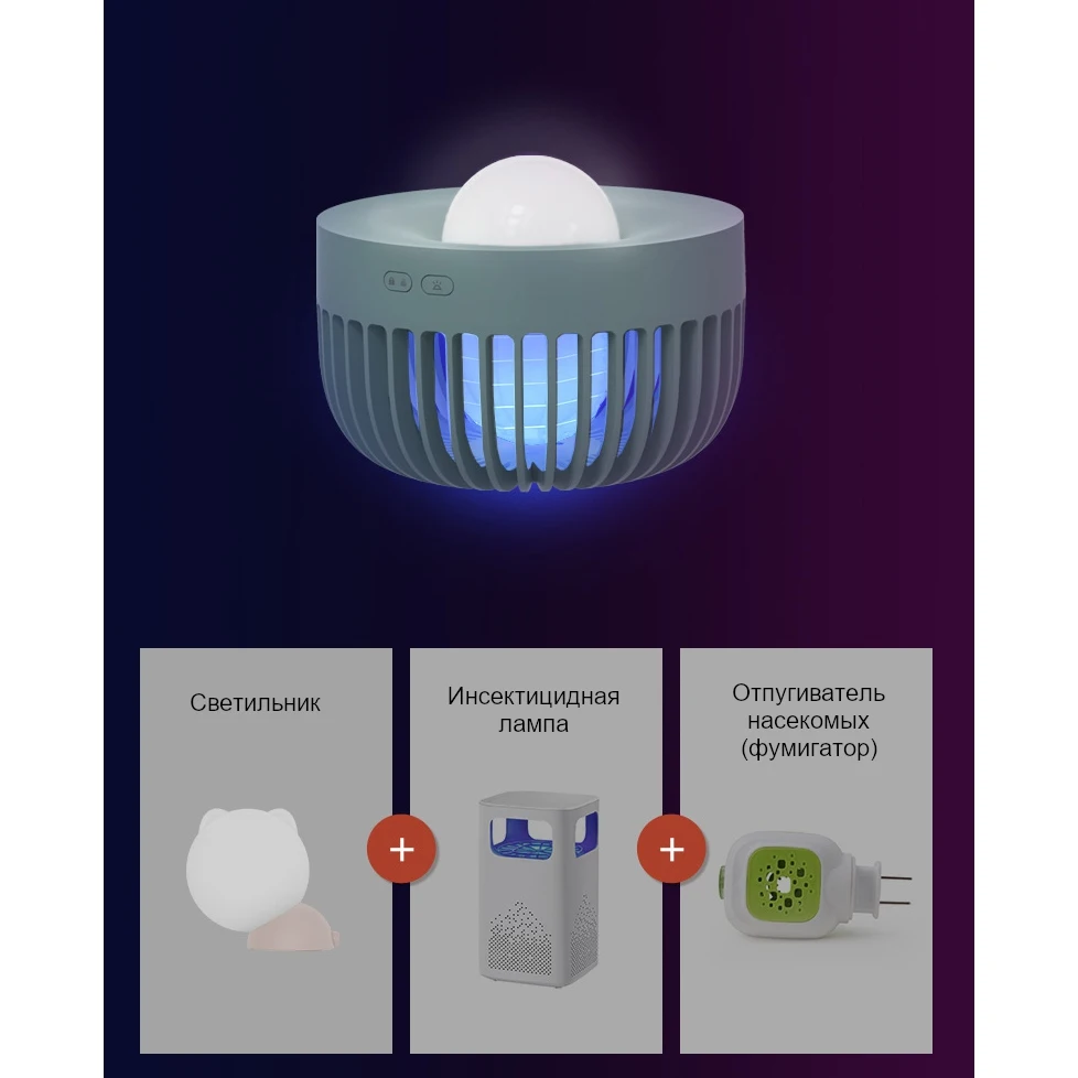 3 in1: Night Lamp (3 brightness modes)/insecticide lamp/insect repeller (fumigator). There is a slot for the anti-mosquito tablet. Battery 2000 mAh. Size 135 х135 X100 mm.