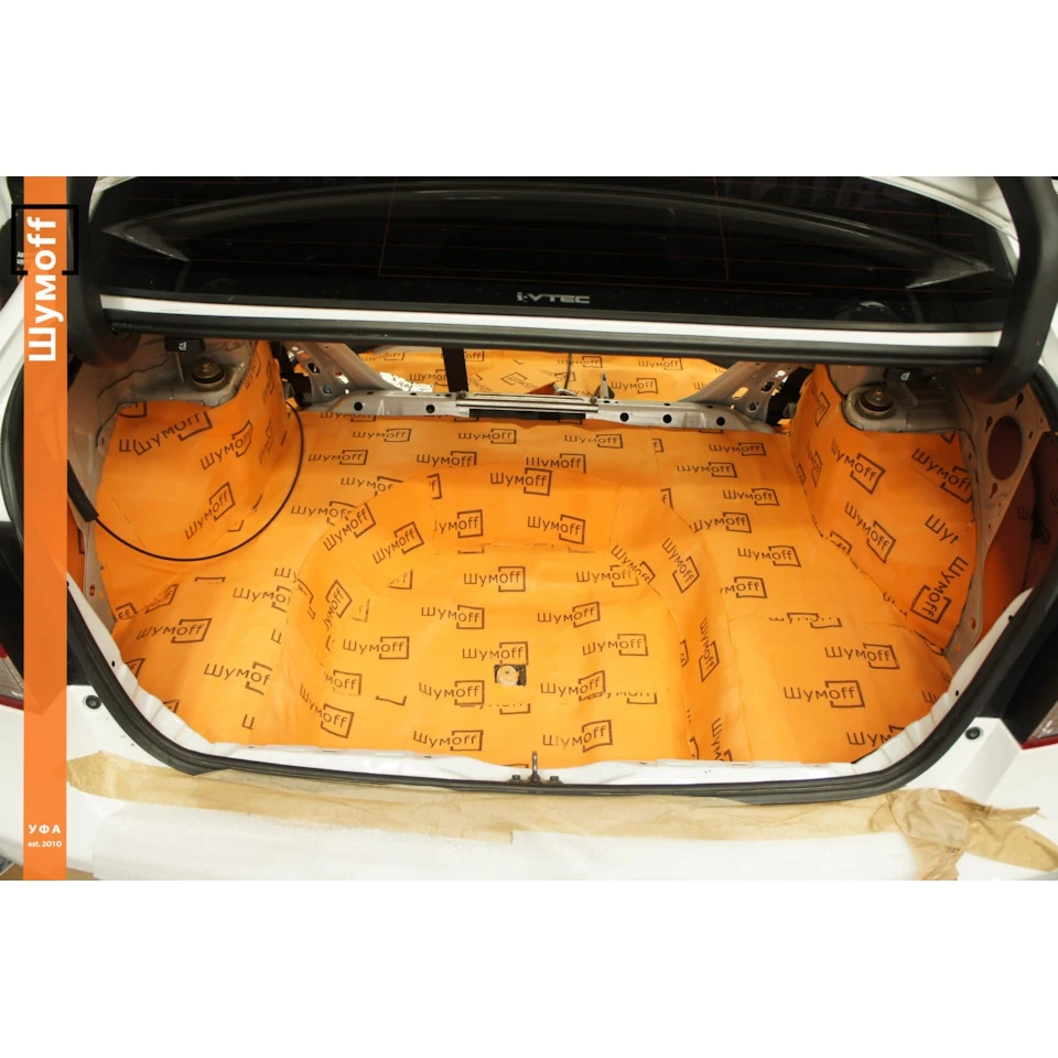 Звуко-теплоизоляционный материал с водостойким липким слоем на основе вспененного полиэтилена - Шумофф П4В. Принцип работы этого материала схож с оконным стеклопакетом: внутри он наполнен воздухом, и не пропускает как шум, так и тепло. Зоны применения: Пол, багажное отделение, двери, крыша, арки.