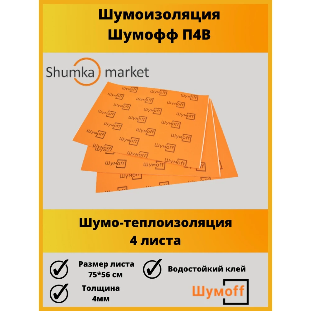 | Название | Шумоизоляция самоклеющаяся Шумофф П4В - 4 листа / Водостойкий клеевой слой / Не впитывает влагу |