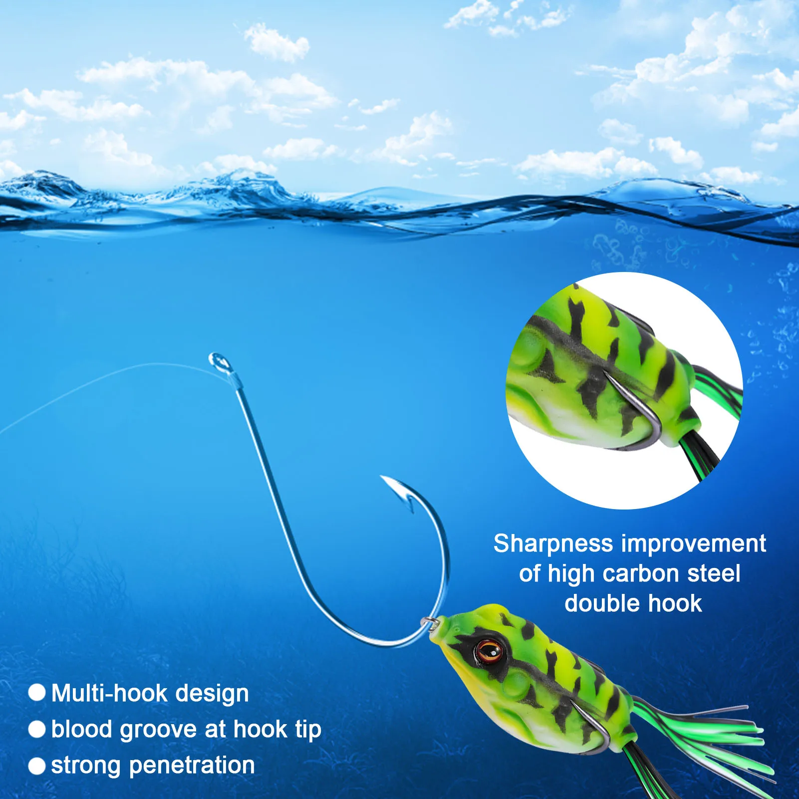 Детальная анатомия, Реалистичные 3D глаза и реалистичные рисунки краски прекрасно воспроизводят настоящие лягушки. Мощные двойные крючки скрыты в животе, что позволяет приманке-лягушке легко проникать в сорняки, коврики или густую растительность.