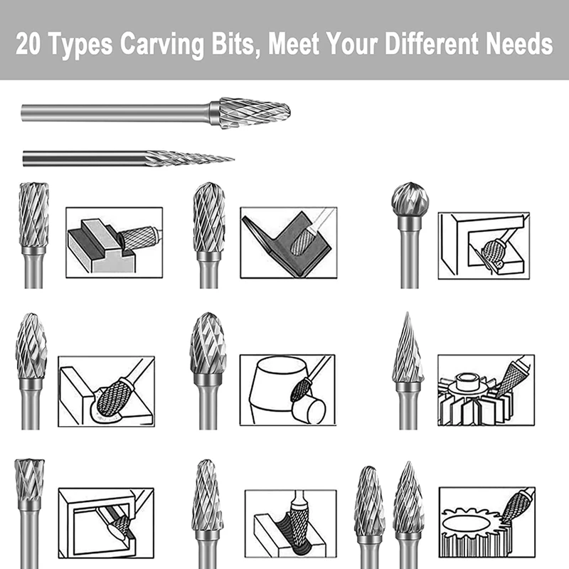 [Хороший набор карбида заусенцев] Хороший выбор DIY резьбы, гравировки и полировки. Подходит для различных типов вращающихся инструментов. Сделать DIY резные вентиляторы намного проще, чтобы сделать деревянную работу. Отлично подходит для работы с мелкими деталями, резки, гравировки, резьбы, касания и отделки. Это также идеальный подарок для резчиков по дереву.