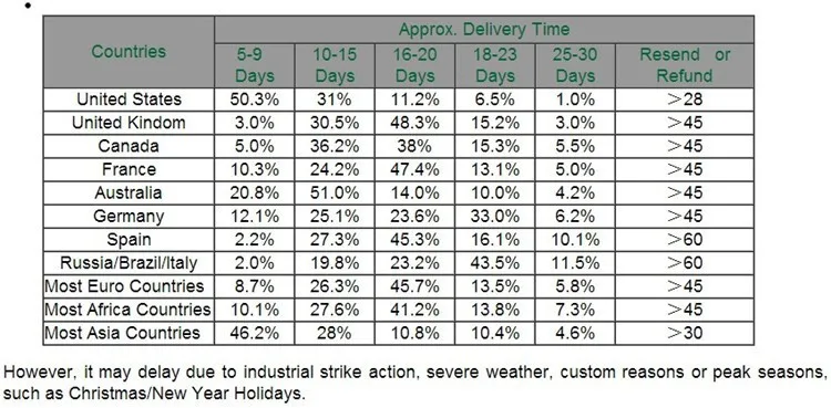 1). Стоимость доставки:Нажмите «Доставка и оплата» на странице деталей продукта, и вы увидите детали доставки. Вы можете вычислить стоимость доставки, введя необходимую информацию. 2). Время в пути:Время доставки зависит от различных способов доставки. 3). Время обработки товара:Время обработки конкретного заказа зависит от типа товара и его наличия на складе.
