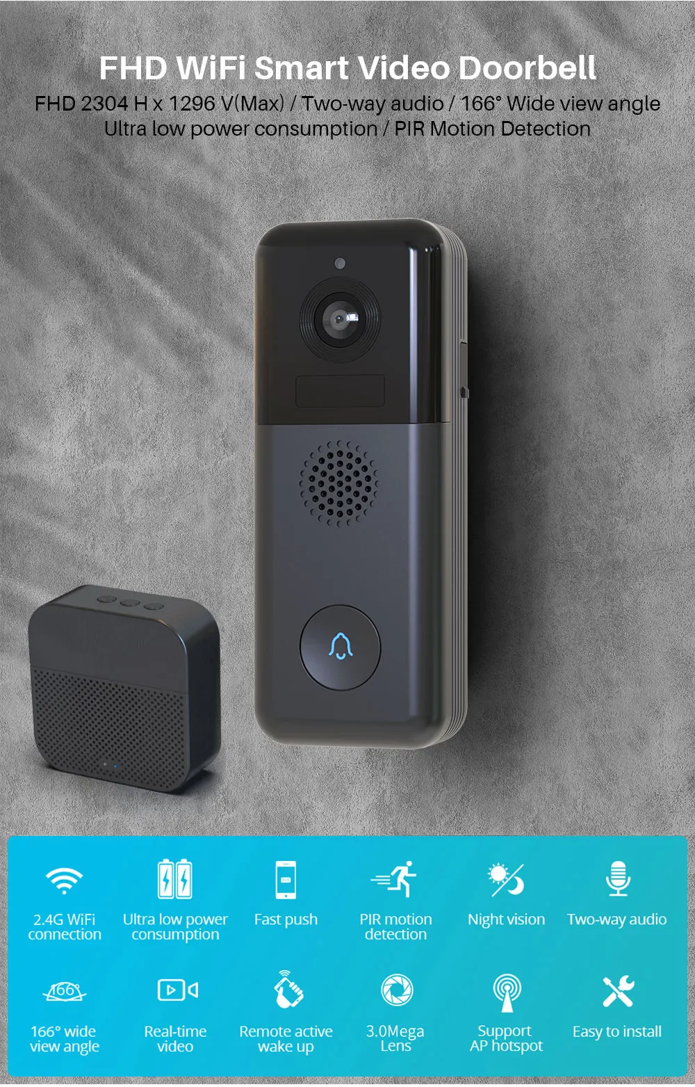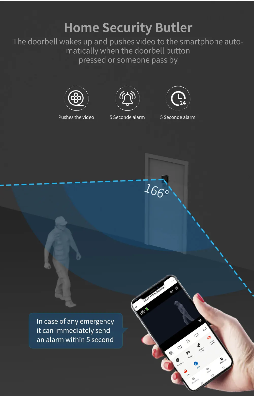 Дверной звонок просыпается и автоматически подталкивает видео к смартфону, когда нажата кнопка дверного звонка или кто-то проходит мимо;