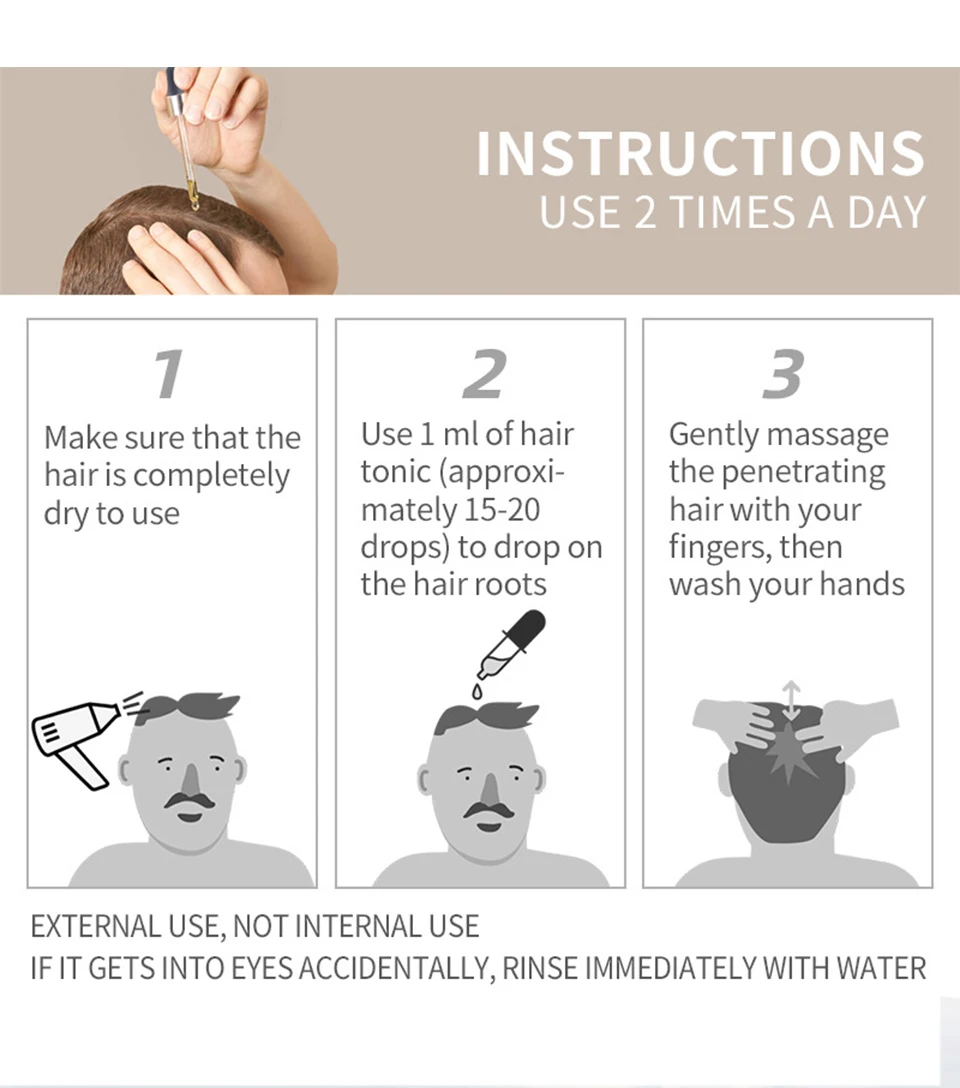 Дважды в день, для достижения наилучших результатов, пожалуйста, используйте 1 миллилитр спрей около 4 -5 спрей), непосредственно используется в меньших волосах, без волос часть головы, помощь в росте волос; Увеличение количества использования или использование не может привести к лучшему использованию; Согласно инструкции, Каждая бутылка используется для не менее 25-30 дней, может эффективно уменьшить выпадение волос и выпадение волос.