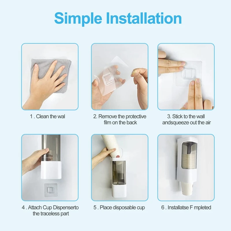 Простота установки: Наклейте твердый клей на гладкую поверхность. После ожидания в течение 24 часов, откройте крышку на верхней части дозатора чашки, чтобы положить бумажные стаканчики в, так что чашки могут быть организованы и храниться более легко.