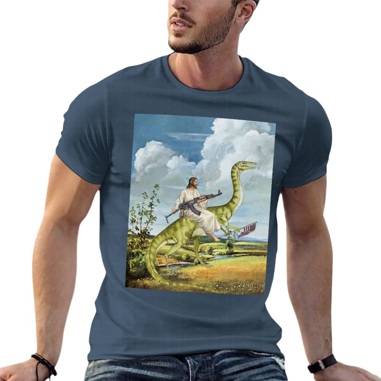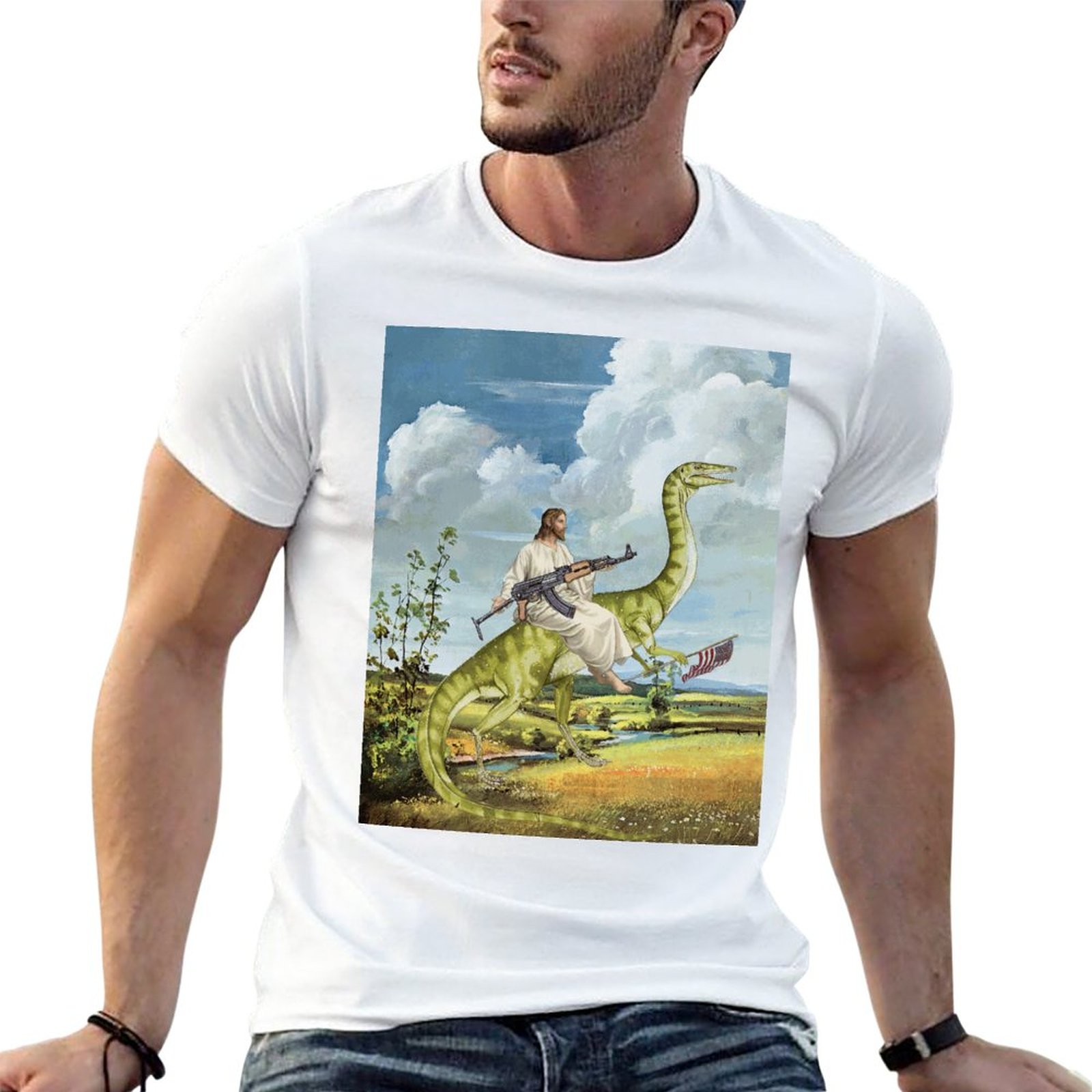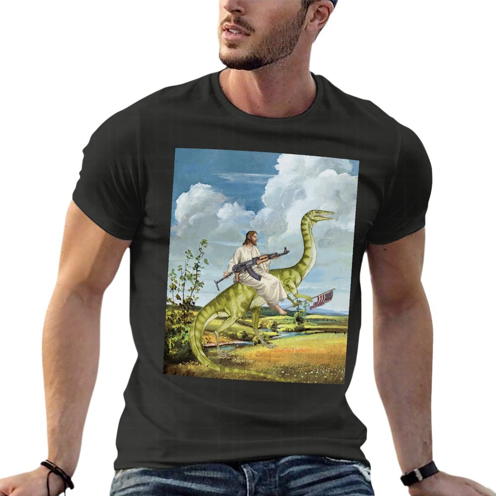 Футболка мужская оверсайз с изображением карты Иисуса на динозавре 100% хлопок |