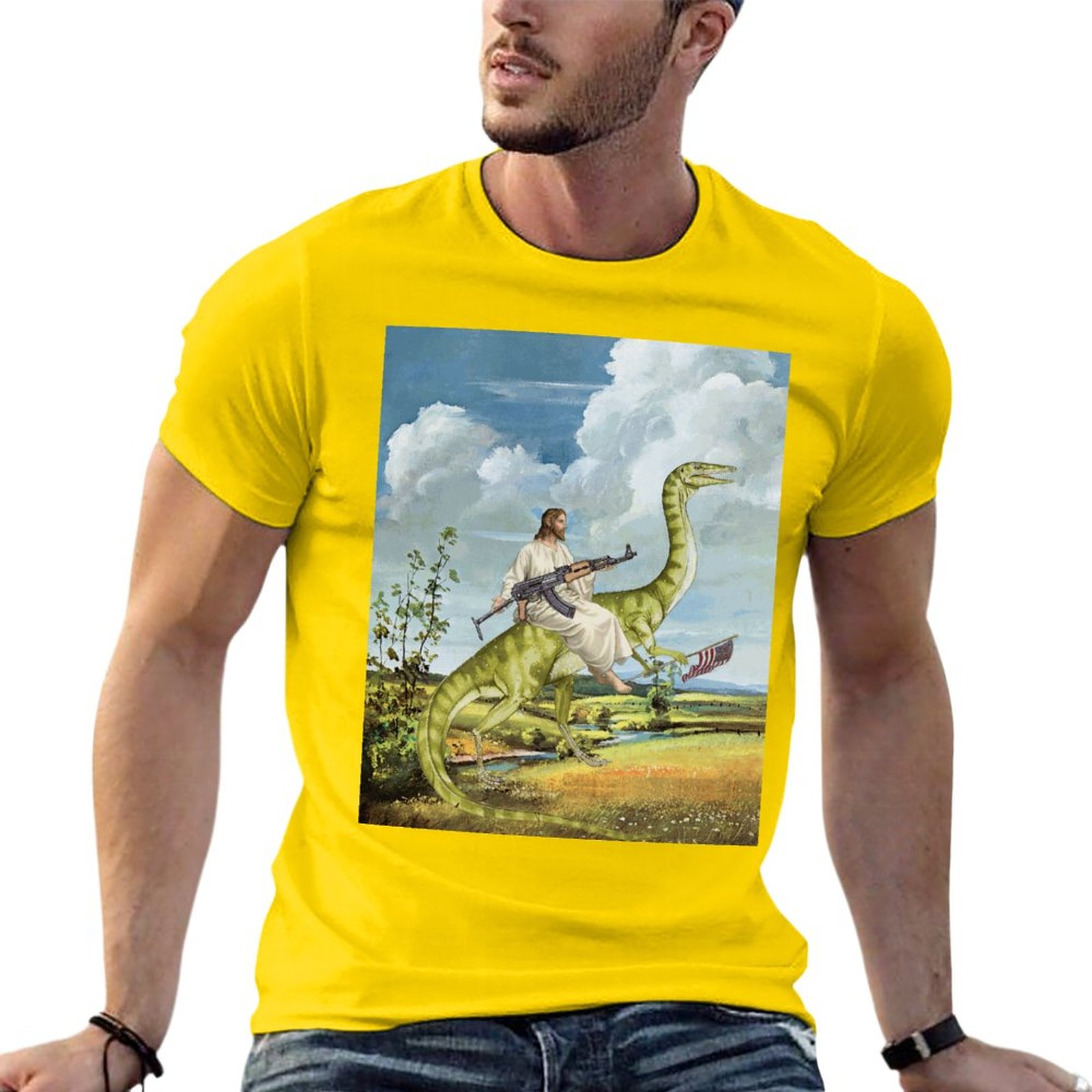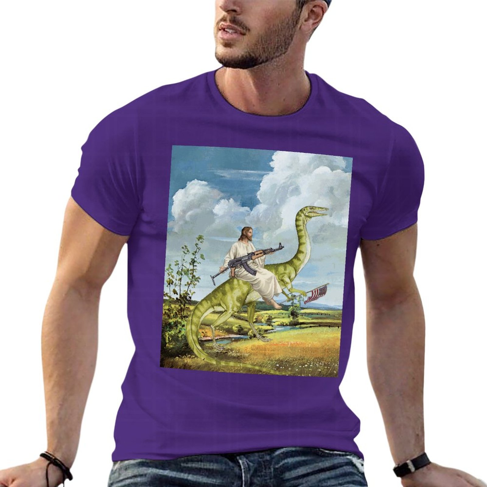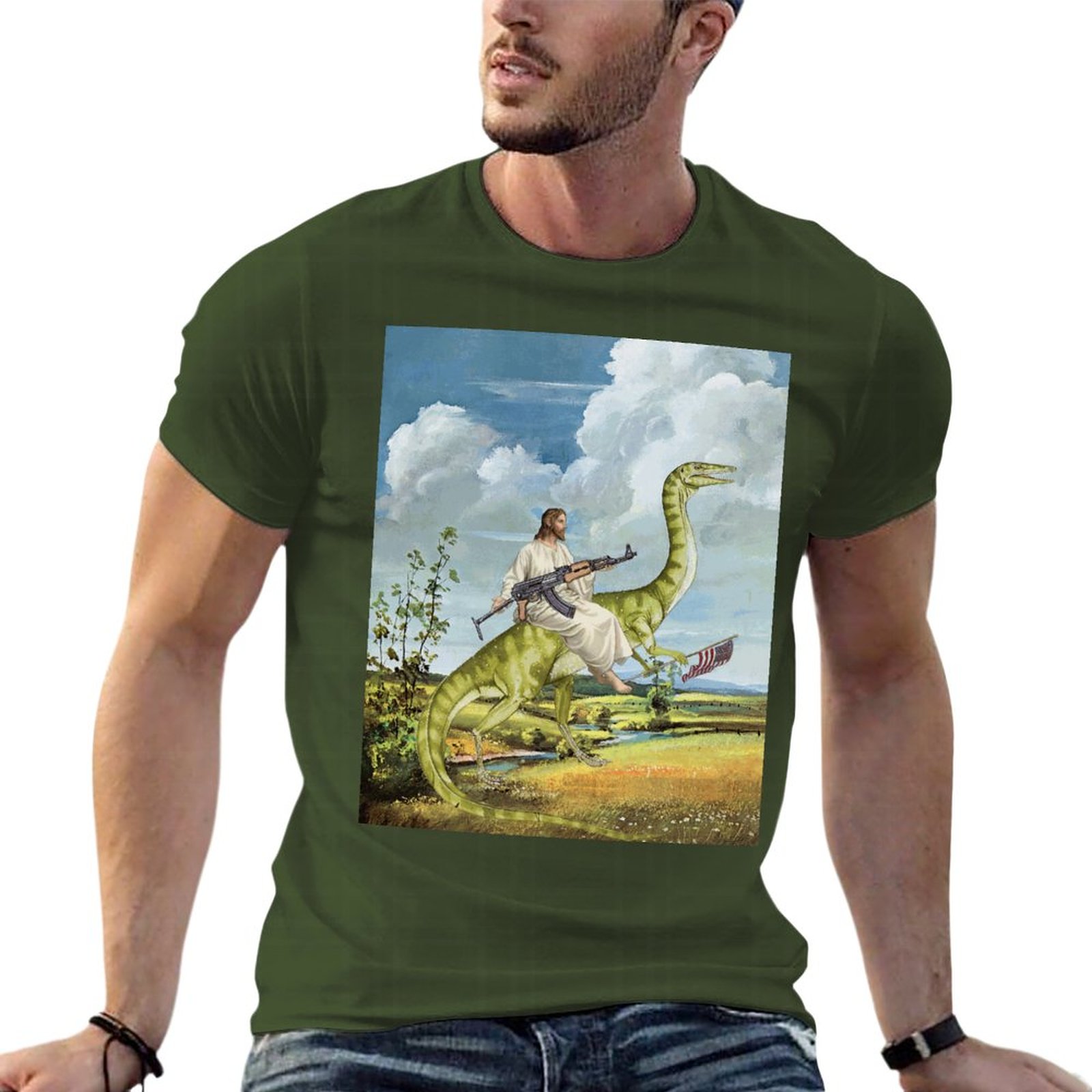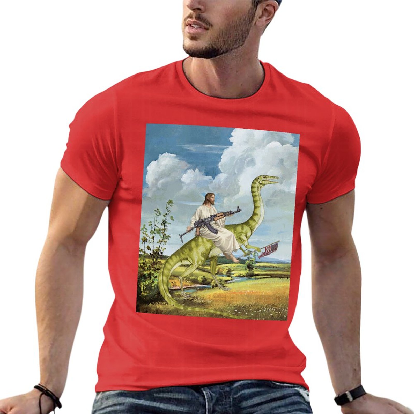 Футболка мужская оверсайз с изображением карты Иисуса на динозавре 100% хлопок |