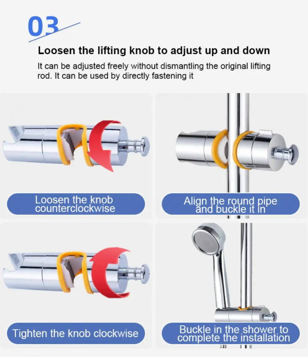 -Простота установки: Нет необходимости в инструменте, этот держатель для душевой головки можно легко заменить, отрегулирув фитинг, чтобы ввинтить в направляющую и затянуть, это означает, что вам не нужно отрывать скользящую планку от стены, экономить рабочую нагрузку и время.
